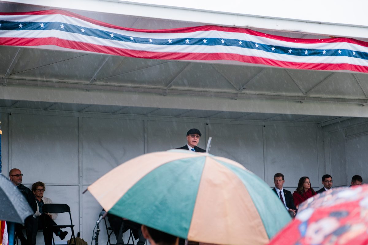 The crowd perched on wet folding chairs and stood on the grass, listening intently as Hadjuk welcomed visitors to the ceremony and as speakers, including U.S. Rep. Conor Lamb, state Rep. Jason Ortitay and Sen. Camera Bartolotta spoke about what Veterans Day means to them.