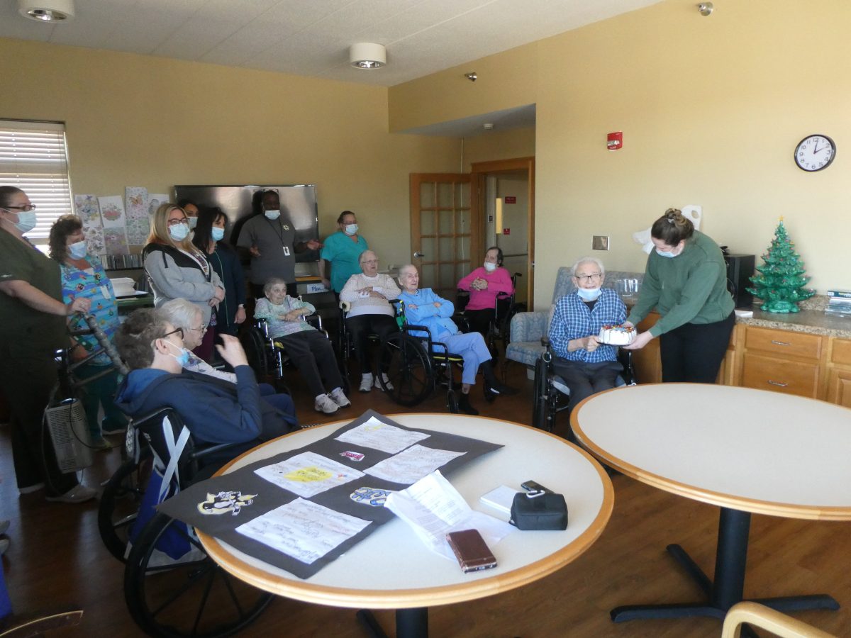 Floyd Marasco celebrated his 100th birthday Monday as he was serenaded with a chorus of “Happy Birthday” by some of his fellow residents at Presbyterian Senior Care at Southmont in Washington.