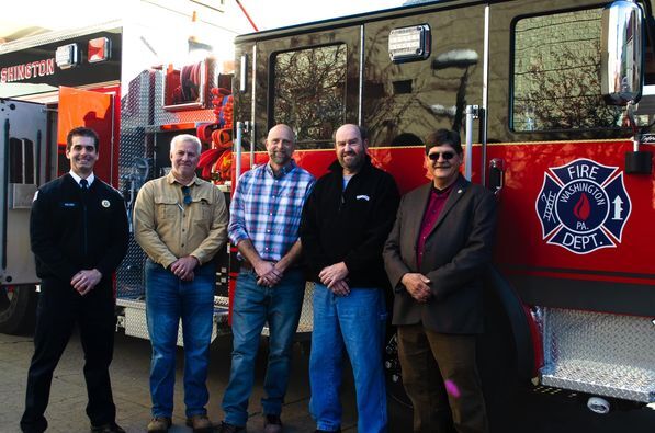 The City of Washington Fire Department dedicated its new Pierce Enforcer rescue engine Saturday. The engine will bear a plaque dedicated to the memory of Jeremy LaBella, a Washington firefighter who died in the line of duty in February 2007 when a roof collapsed during a structure fire. The vehicle replaces an engine that has been retired, and is the beginning of a modernization plan for the fire department. Pictured at the dedication ceremony are, from left, Chris Richer, chief of Washington’s fire department; Scott Putnam, Washington’s mayor; Councilman Andrew Callan; Councilman Kenneth Westcott; and Councilman Joseph DeThomas. The vehicle was paid for through grant funding.