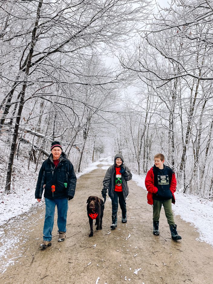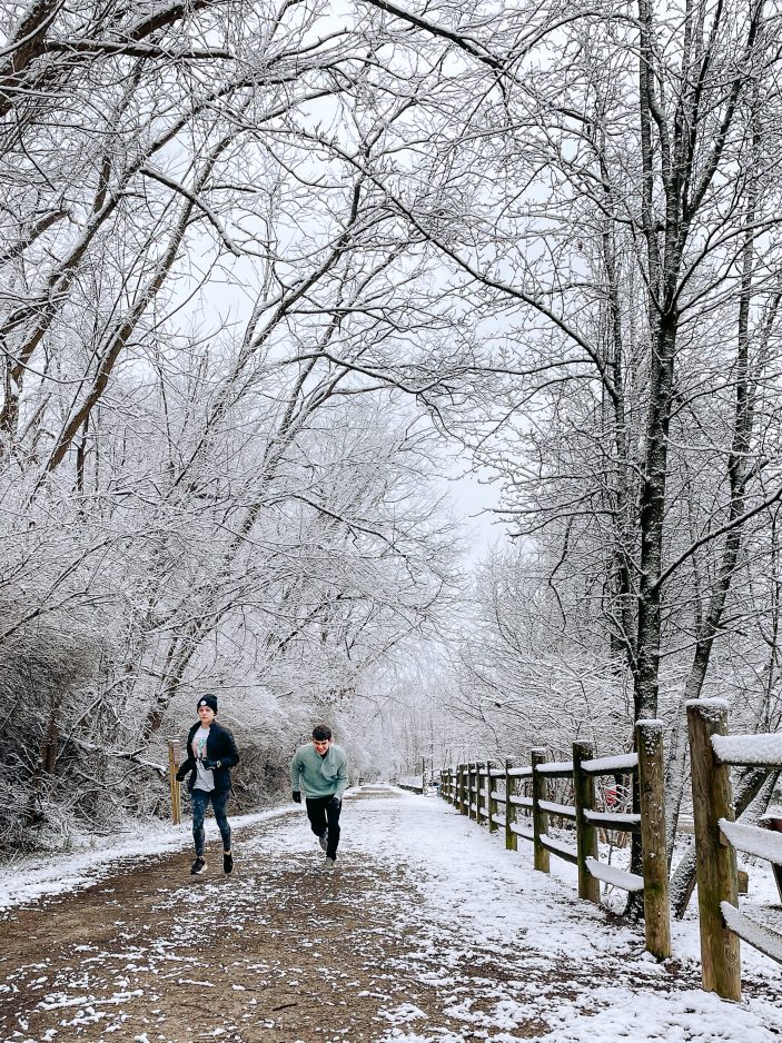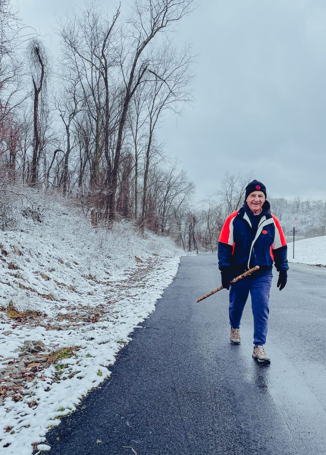 The Tandem Connection parking lot was dotted with cars Monday morning, when folks braved seasonal weather to walk or run the Montour Trail in Canonsburg. John Knabb and his grandsons, twins Kaleb and Trey Knabb, 9, all of Peters Township, strolled beneath snow-covered trees while Dozer the chocolate lab sniffed to his heart’s content. “We could walk and talk all day,” Kaleb Knabb proclaimed. As the Knabbs finished their walk, Mt. Lebanon high schoolers Josie Engle, a cross-country and track runner, and Michael Ferreira, a soccer player, hit the trail for a morning run. Sunshine replaced gray skies around lunchtime, but the snow clouds returned, though that didn’t bother Rob Ross, of Washington, who walked briskly through Washington Park Monday afternoon. “I’m here every day,” he said, adding, “I walk between 60 and 80 minutes every day.”