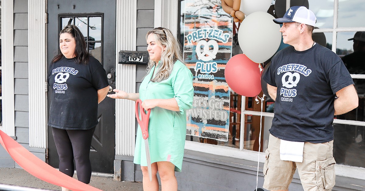Pretzels Plus, which moved from Washington Crown Center in North Franklin, cut the ribbon Tuesday on its new location at 189 S. Main St. Cutting Board Deli, at 101 N. Main St., and BaitFish, at 35 W. Chestnut St., will cut the ribbon Thursday and Friday, respectively. Both Cutting Board and BaitFish, a fishing supply store, have been operating since March 1.