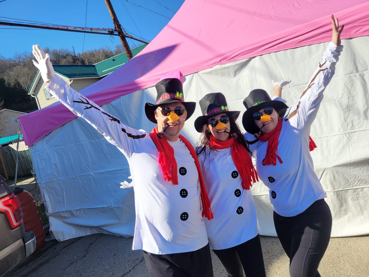 Walter MacFann, who is a trustee for the California Area School District Foundation, dressed as a snowman alongside Brenda Workman, middle, and Rebecca Smitley before the trio took the plunge into the Monongahela River during Saturday afternoon's Frosty Frolic fundraiser in Coal Center.