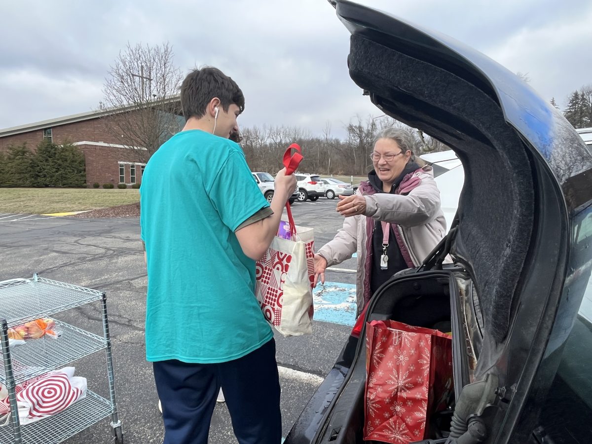 When Lovelace finishes shopping, three teens wheel her cart to her car, unload the bags into her car, wish her a happy day, and return to the social hall to help other shoppers.