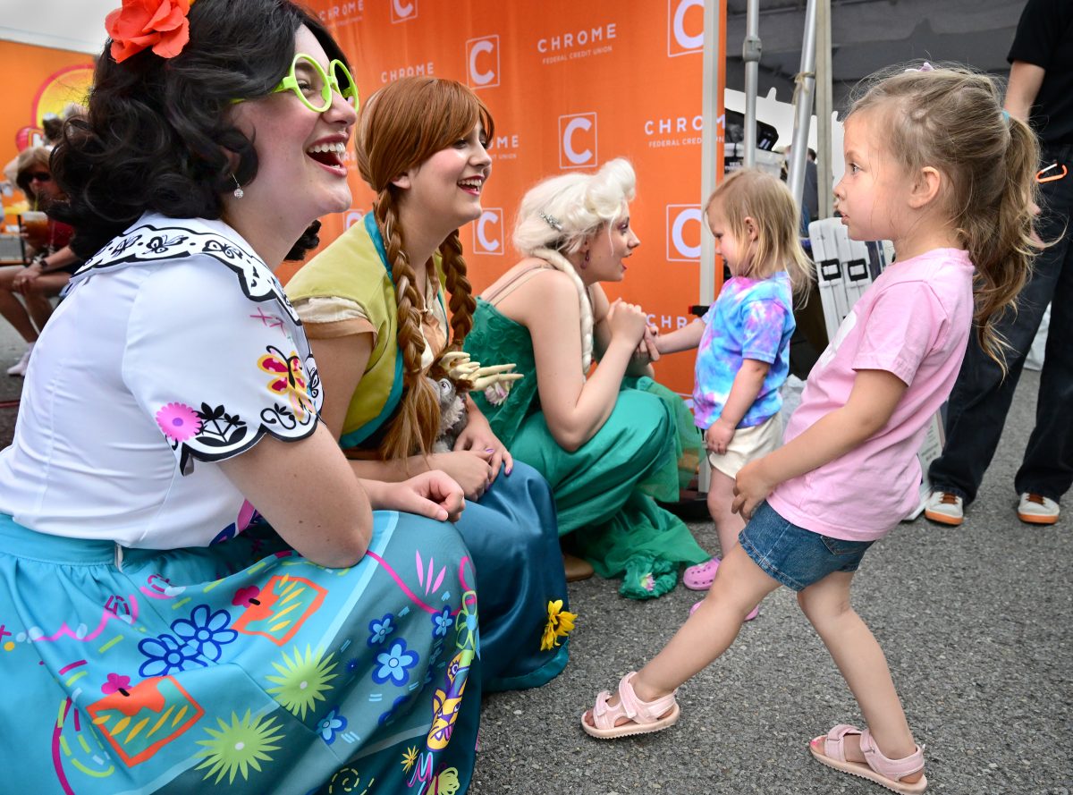 Elizabeth Engle (Mirabella), Avriella Miller (Anna), and Addison Davis (Elsa), greet Blakely McConnell (center) and Rowan Sweeney (right) on behalf of Chrome Federal Credit Union at the Food Truck Festival on May 24.