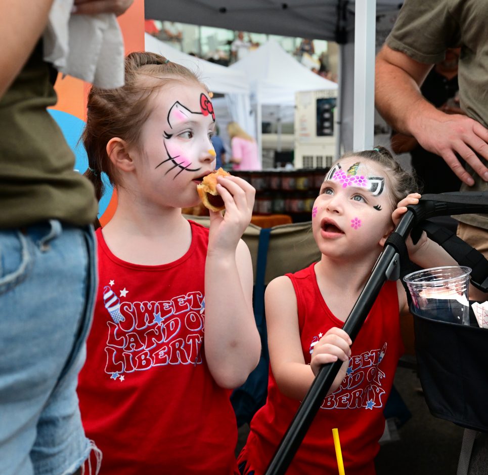 Sisters Ellie and Emma Lyons snack together at the Food Truck Festival on May 24