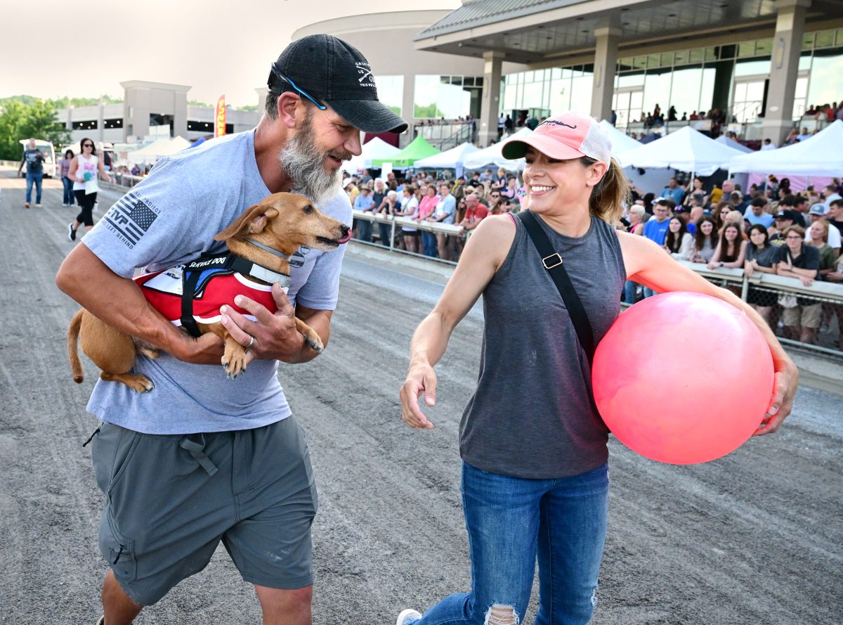Jay and Chrissy Watson leave the track with Brimley after the first heat of the weiner dog races at the Food Truck Festival on May 24.