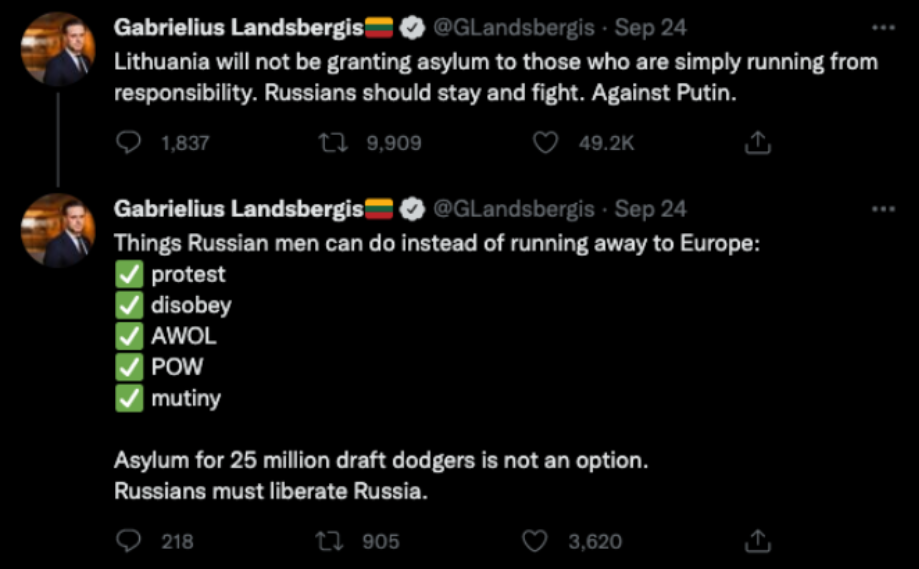 But not all Russia’s neighbors have been so hospitable. As of now, surprisingly, the three Baltic states, Finland, and Poland – the countries you would normally expect most help from – have closed their borders even for those Russians who hold valid Schengen visas (visas that allow foreigners to travel to most European states.) For instance, Gabrielius Landsbergis, the minister of Foreign Affairs of Lithuania, recently in one of his “tweets” claimed that the measure is to “make Russians stay and fight. Against Putin.” Another, more direct, example of such talk by the official can be seen in this reply to the tweet dated Sept. 24, in which those Russians who are against the mobilization and are forced to flee Russia are called “dodgers with responsibility.”