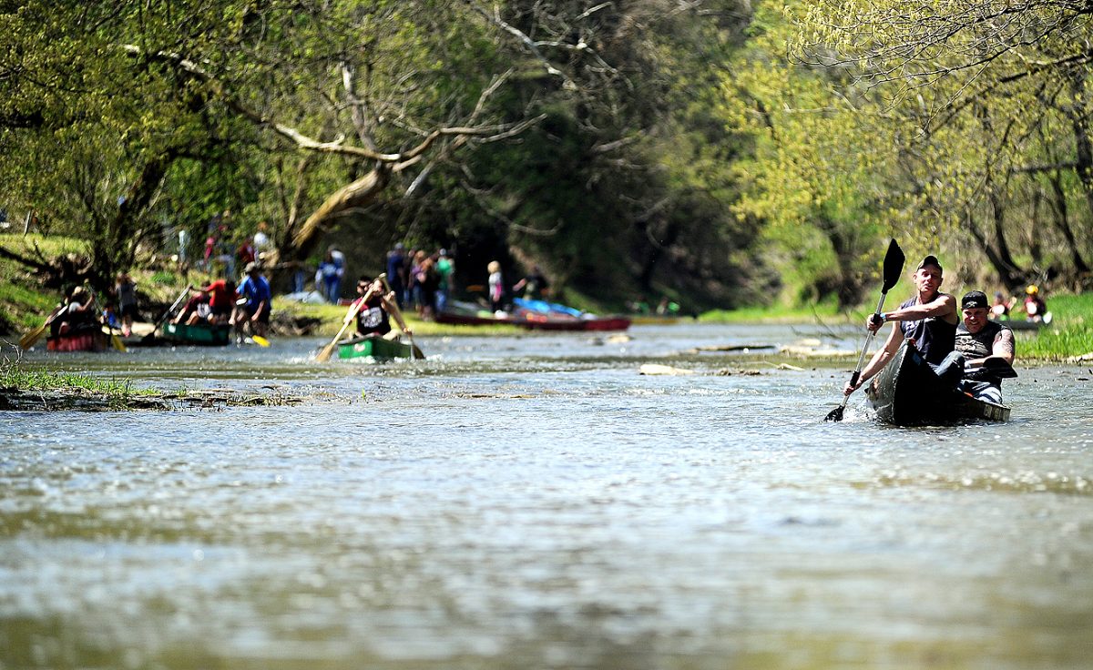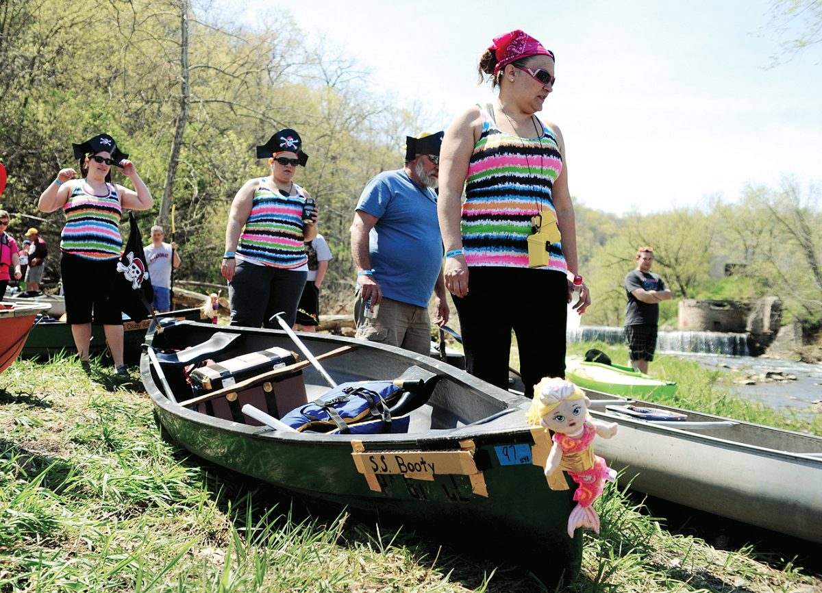 This year, 124 canoes were set in the water Saturday, April 27, some top of the line, others a mishmash of wood, plastic and inner tubes. Two-by-two they were launched amid the cheers and jeers of the large crowd at the top of the hill that runs along the creek.
