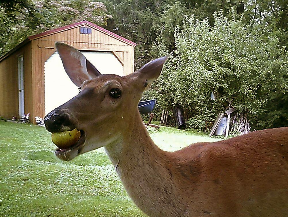 Blair Guthrie of Washington used a trail camera to get this photo of a deer enjoying a snack under his apple tree.