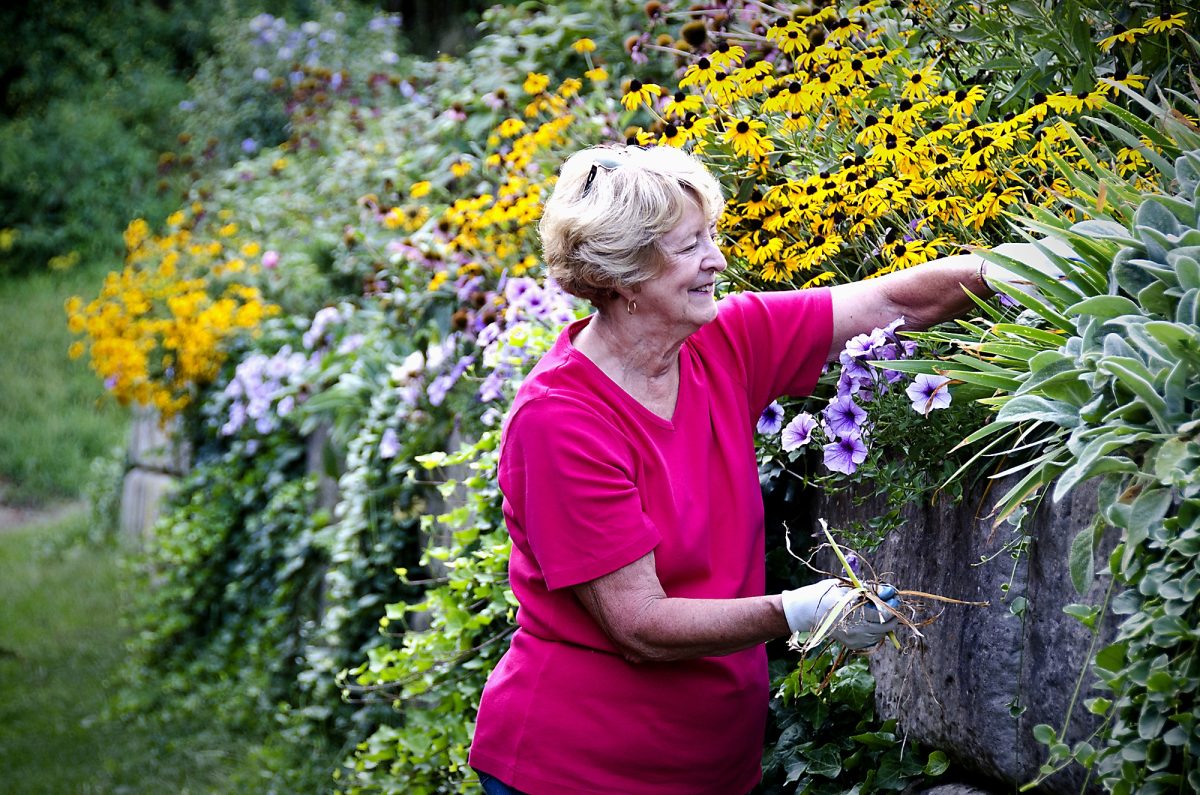 Photo by Robin Richards Penn State Master Gardener Janet Rhoades of Washington cleans debris from the lush 75-foot wall garden she has designed, planted and maintained for four years at Washington County Agricultural Fairgrounds. The garden is one of about 15 at the Arden site, all of which are created by local volunteers and range in size from small planters to a mini-park complete with gazebo. Rhoades has been tending gardens at the fairgrounds for 15 years. This overflowing bed includes echinea, black-eyed Susan, hibiscus, coreopsis, petunias, day lilies, peonies, asters, sedum, roses and irises, all donated by local greenhouses Hothouse, Wagner's, Ianoti and Bedners.