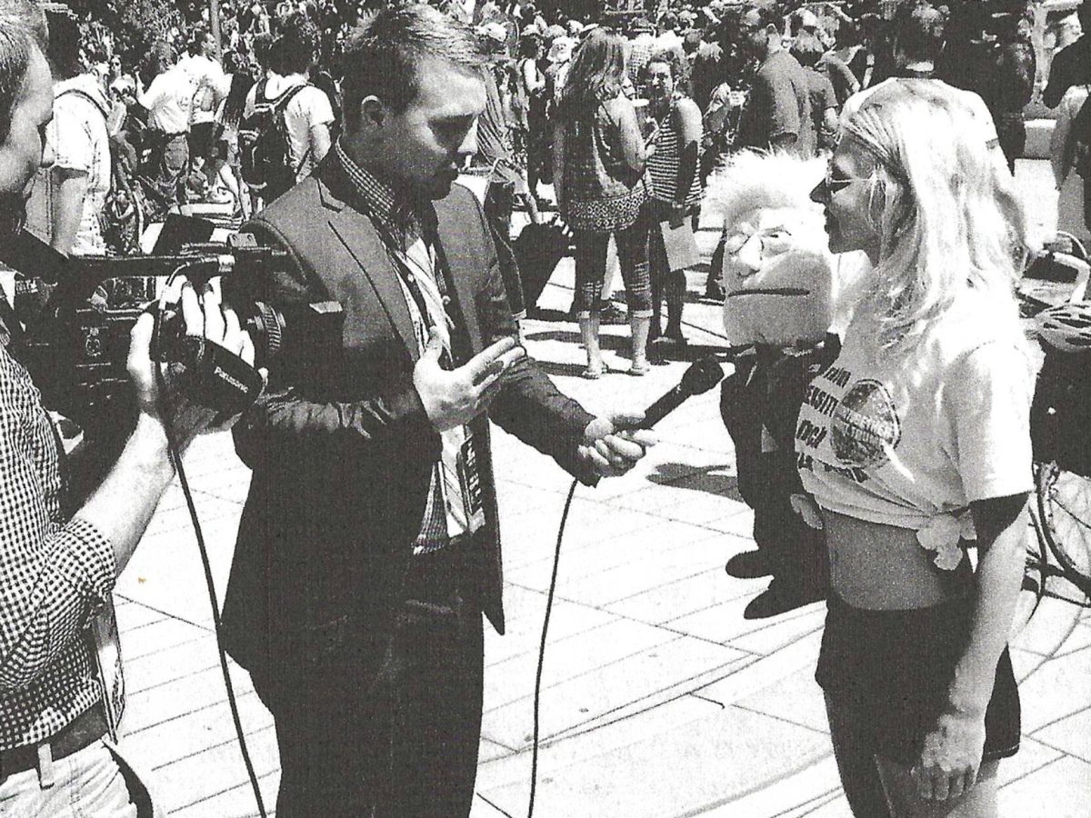 Cleveland, July 2016: Ventriloquist April Brucker is performing with the puppet she calls Donald J. Tramp in a public square outside of the Republican National Convention.