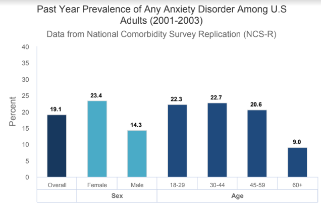- An estimated 19.1% of U.S. adults had any anxiety disorder in the past year.