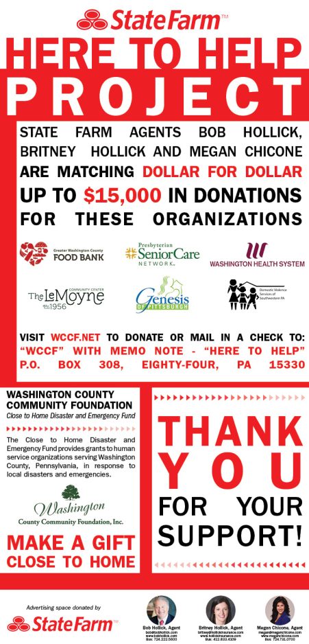 To donate to the State Farm Here to Help Project, and have your donation matched by Bob Hollick, Britney Hollick and Megan Chicone, visit https://www.wccf.net/for-donors/here-to-help-project