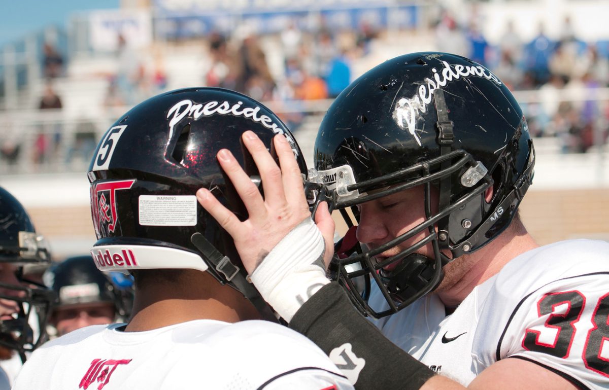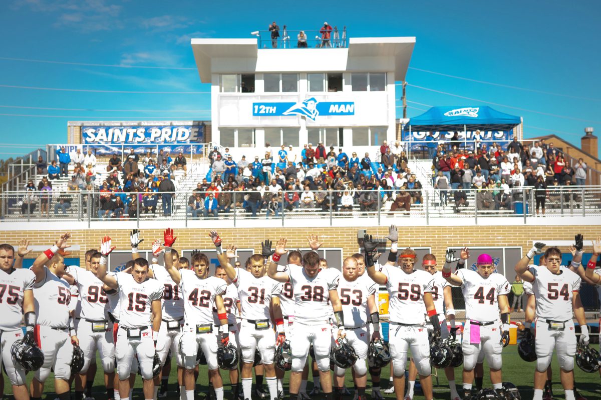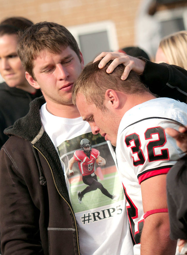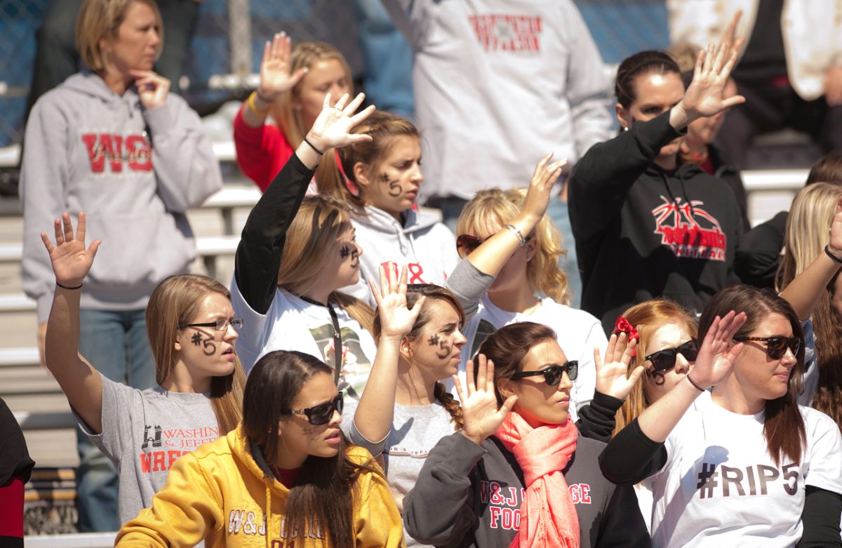 Washington & Jefferson football players and fans take a moment to honor Tim McNerney at Saturday?s game against Thomas More College at the Bank of Kentucky Field. McNerney, a Presidents? running back who wore the No. 5, was the victim of a homicide last week less than a block off campus in Washington. For more on the game and tribute, please see Page C1.
