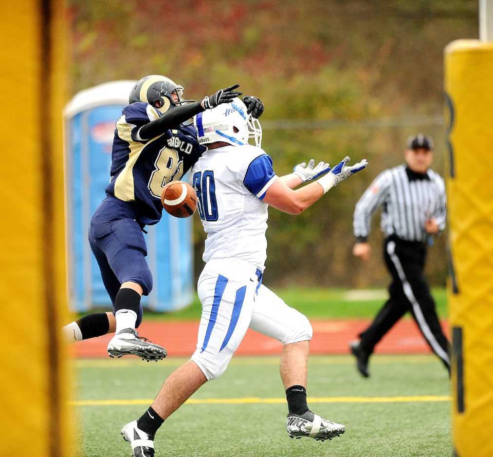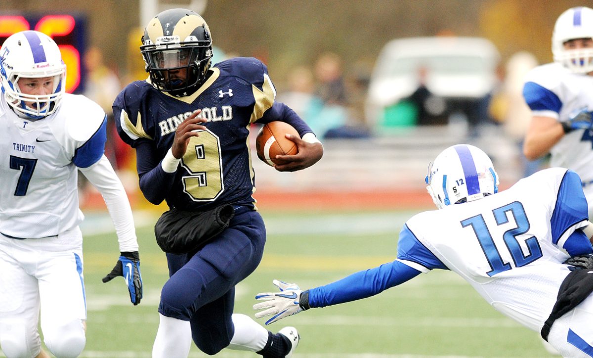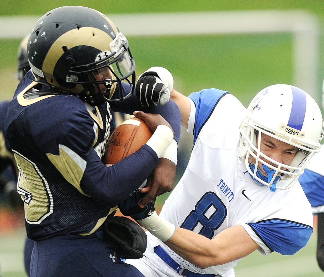 MONONGAHELA – Yesterday’s football game between Ringgold and Trinity was supposed to be played Friday night but was pushed to Saturday afternoon because of a water main break. In the meantime, sunny and gorgeous turned to cold and rain, and Trinity locked up a WPIAL Class AAA playoff spot – something that wasn’t a sure thing only 18 hours earlier. A letdown for either side would have been understandable, with only playoff seeding at stake, but what transpired at Joe Montana Stadium was more than worthy prelude to the playoffs, as Trinity knocked off the Rams, 31-30, in double-overtime to lock up the No. 3 slot in the Big Nine Conference. “We knew if we didn’t show up today that we were going to be the 16th seed,” said Trinity junior Patrick Frey, who ran 31 times for 153 yards and a two-yard touchdown. “We knew we had to get this game.” And, oh, how the Hillers did it. The game-ending play was Trinity’s entire team stuffing Ringgold’s Dayshore Majors on a two-point conversation attempt, but there was so much more that led to that. Start with 8:04 remaining in the fourth quarter. After moving 31 yards on 13 plays with Majors under center – starting quarterback Nico Law was injured on the previous drive – Ringgold’s Connor Dudas tried 39-yard field. He missed wide left, but a roughing the kicker penalty permitted a second attempt. Dudas made the second and the third after a Trinity timeout forced him to repeat the 34-yard kick. In overtime, Ringgold’s Demetrious Louis fumbled on the first play, Trinity (5-3, 5-4) gained just one yard, and Sam Trapuzzano’s 26-yard attempt was also wide left. In double overtime, Frey nearly lost the ball on second down, and Don McWreath gave Trinity a 31-24 lead with his second one-yard touchdown run. Then, faced with fourth-and-goal at the 1-yard line, Ringgold ran a play where Majors slipped the ball under his legs and faked a dive; the Trinity defense bit, allowing Louis to pick up the ball like a fumble and score. “Probably the best football game I’ve ever been a part of,” said linebacker Evan McWreath, one of several defenders who joined together to stop Majors on the two-point conversion attempt. “It was unbelievable.” The loss means Ringgold (4-4, 4-5), which will be the No. 5 seed out of the Big Nine, has lost three straight and four of five entering the playoffs. “I’m not going to say anything negative because we lost the turnover battle, and that’s a contributing factor to us losing the football game,” Ringgold coach Matt Humbert said. “The kids fought hard. Effort was there, tenacity was there, and that’s all you can ask for as a coach.” Trinity turned it over on downs after two nine-play drives to start the game, and Ringgold scored long touchdowns both times, a 73-yard pass from Law to Joey Wall and a 43-yard run from Louis, who broke four tackles en route to the end zone. McWreath got the Hillers on the board after an Evan Sherrieb interception, but Trinity’s attempt at a field goal before the half was botched by a pair of false start penalties. Law made it 21-7 with a 60-yard run following an Alan Pritchett interception before Trinity answered with a 67-yard drive that was capped by Frey. Trapuzzano made a 36-yard field goal, and Robert West tacked on a two-yard TD run to give Trinity 17 consecutive points that turned a 21-7 deficit into a 24-21 lead, setting up Dudas’ late kick and an overtime session that was well worth the price of admission. “It would have been very easy to come out flat,” Trinity head coach Ryan Coyle said. “The sun wasn’t out, and I think for some guys it might’ve felt more like a JV game. We started off a little sluggish, but then we got things rolling after we made a few adjustments at halftime.” Extra points Louis finished with 20 carries for 118 yards and two touchdowns. … Law accounted for 166 yards of offense … Wall was injured in the fourth quarter and received attention by the on-site ambulance. Humbert had no immediate information on either Wall or Law’s conditions. … Trinity fullback Connor Durko had five carries for 88 yards.
