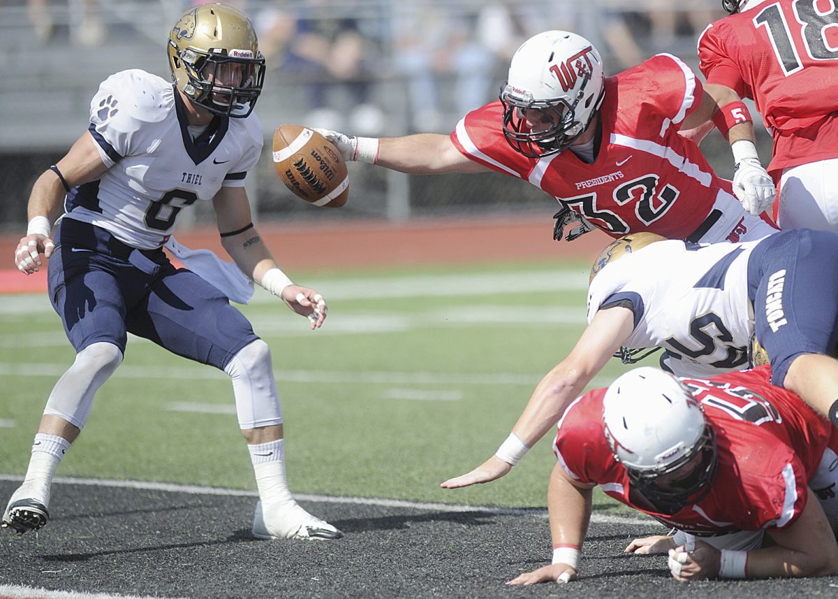 Thiel (0-2, 0-4) cut the lead to 10-6 in the second quarter on a fourth-down halfback pass from Josh Potter to Bill Frizzi that went 30 yards for a touchdown.