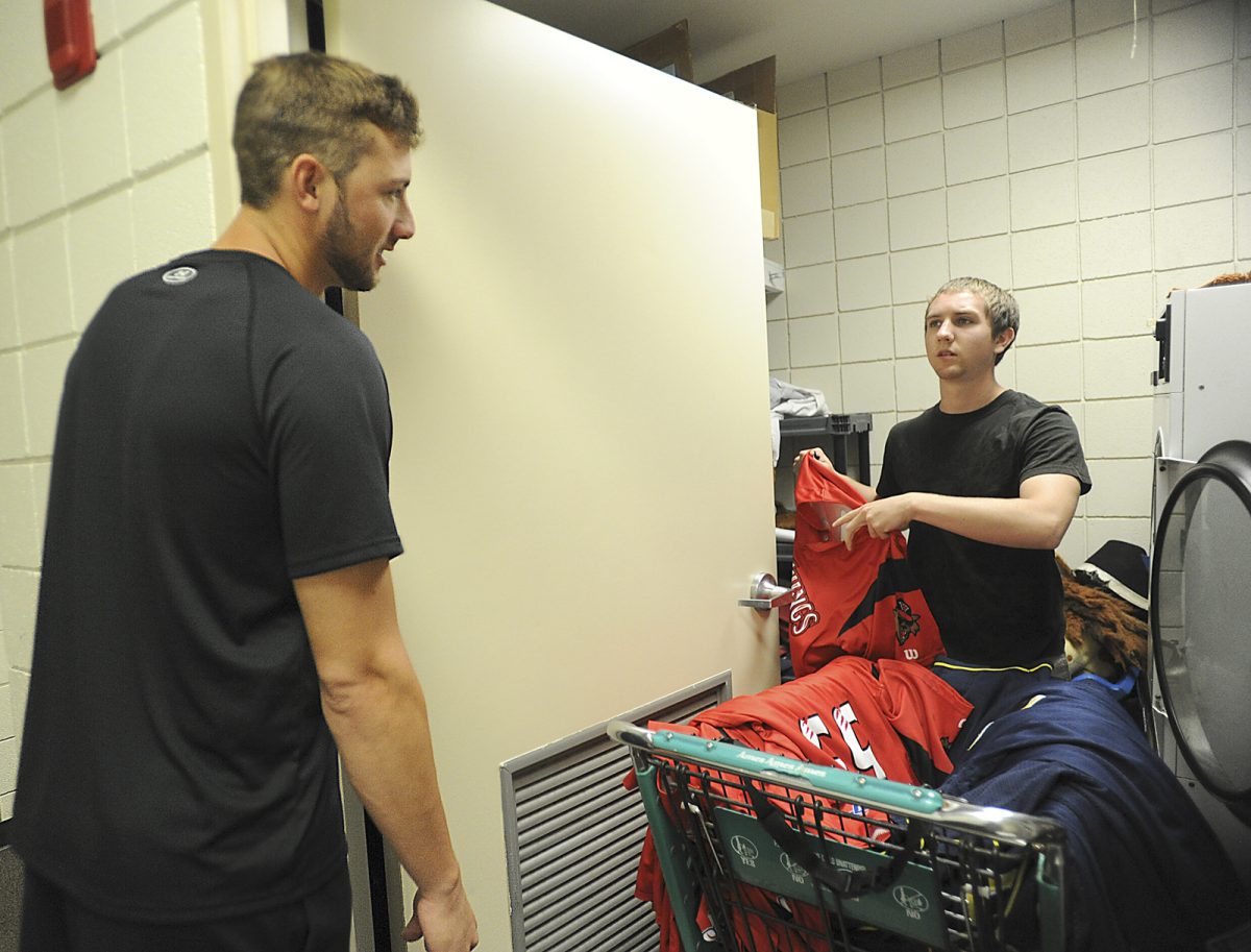 The game ends – a 5-3 Wild Things victory – and the laundry begins again. Players make their way through the hallway past Justin Gibson to and from the showers or trainer’s room and toss their dirty uniforms and wet towels into the shopping carts/laundry bins.