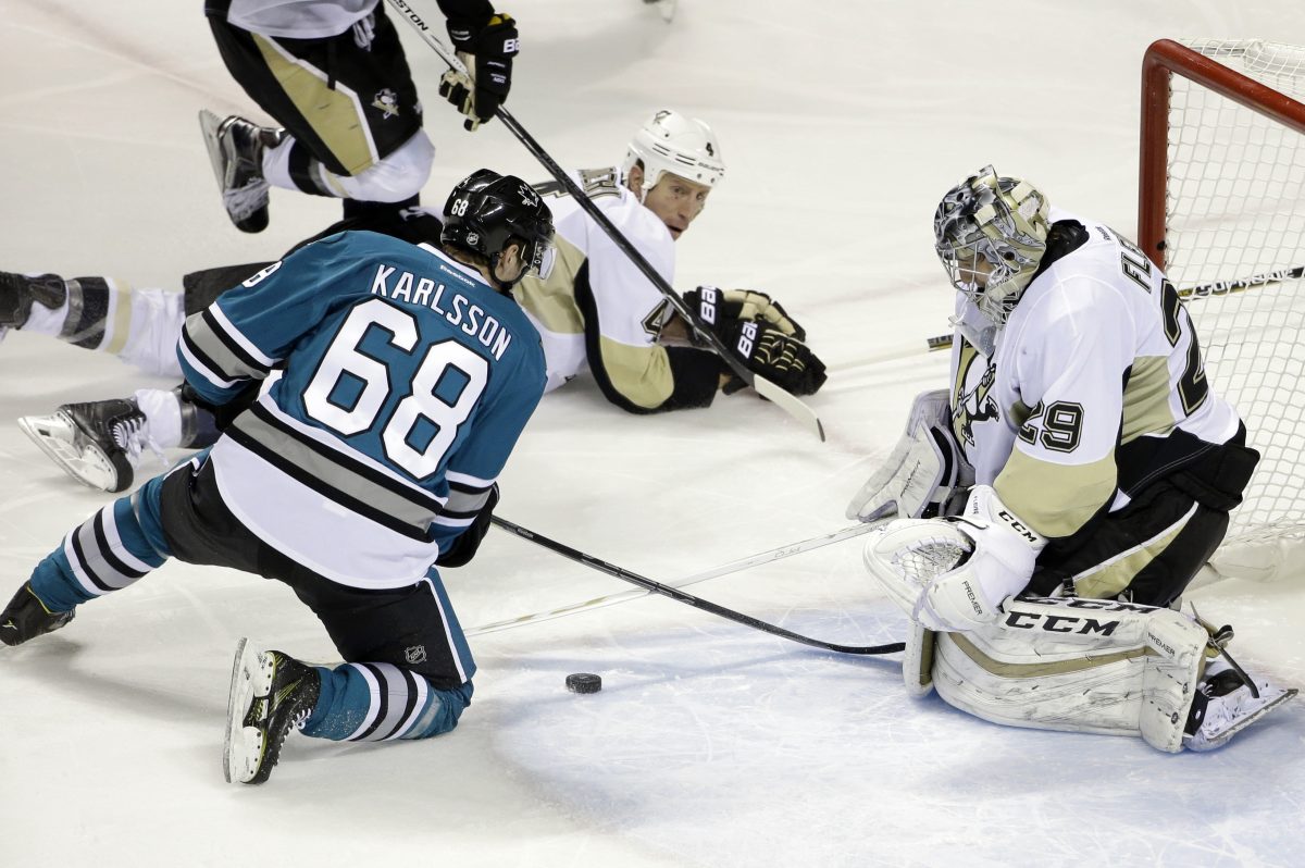 After years of struggles in San Jose, the Penguins built a 2-0 lead with some help from some fortunate deflections. The only goal in an action-packed first period came when Kessel skated out from behind the net and attempted a centering pass that deflected off Martin’s skate and sneaked past Jones on the short side.