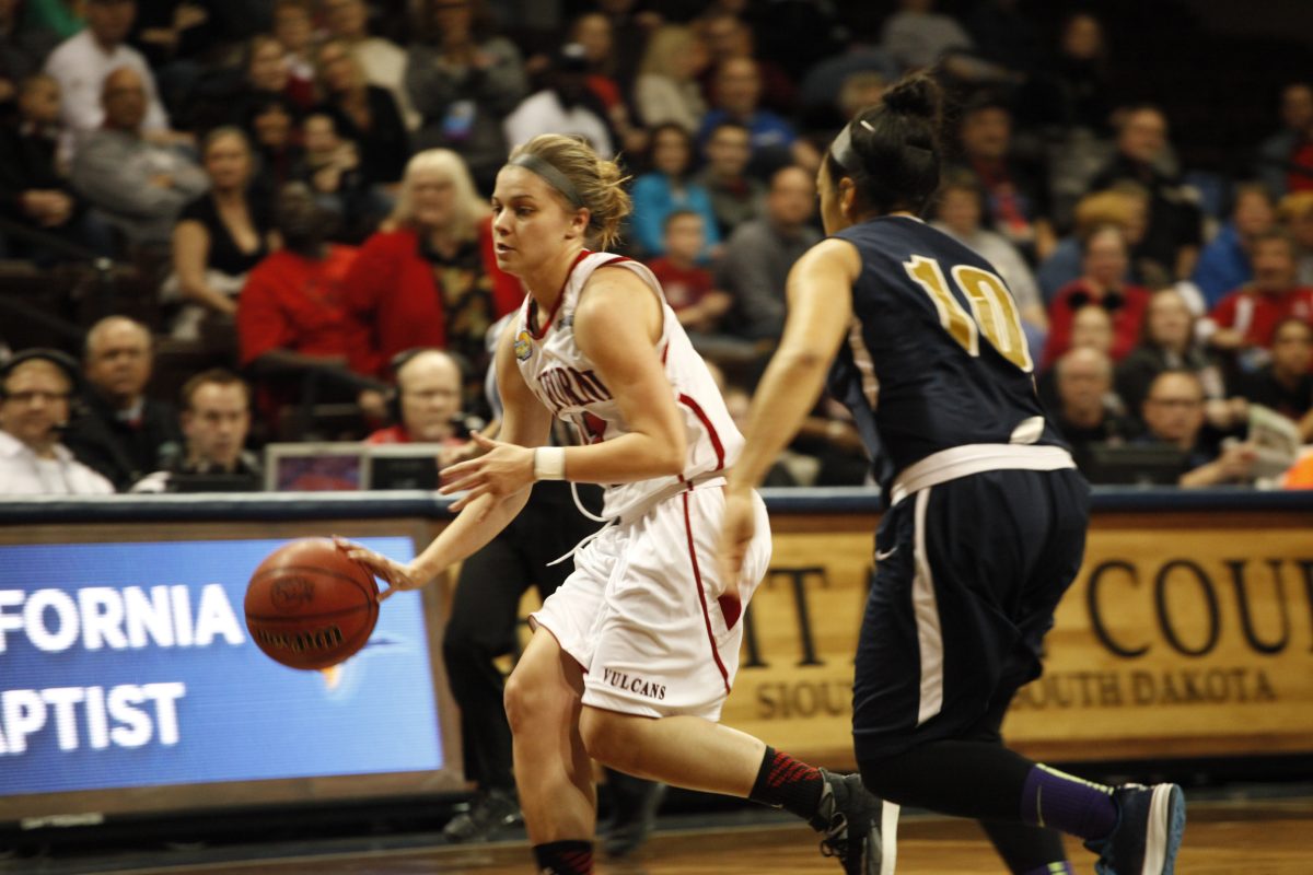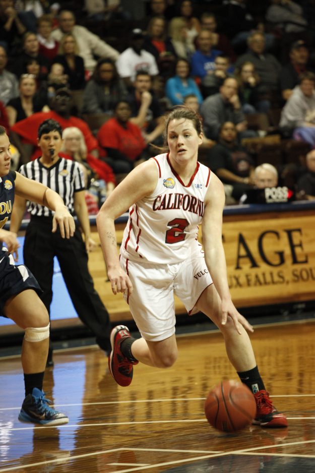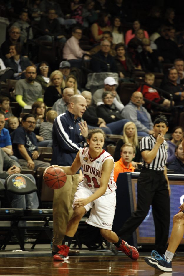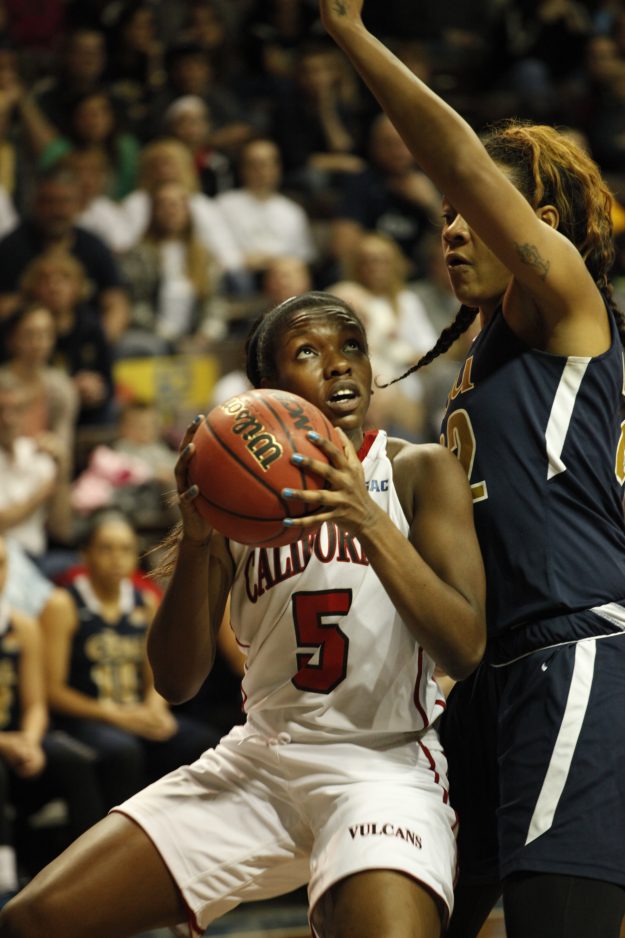 The Vulcans had to deal with Darsha Burnside, a 6-6 center who had been having an impressive tournament by averaging 22 points and 17 rebounds per game in CBU’s wins in the Elite Eight and Final Four. She ended up with solid numbers, registering her 25th double-double with 27 points and 12 rebounds, but it took her some time to get going. When she finally did score with just over 10 minutes to play in the first half, Cal had already opened a 26-14 lead.