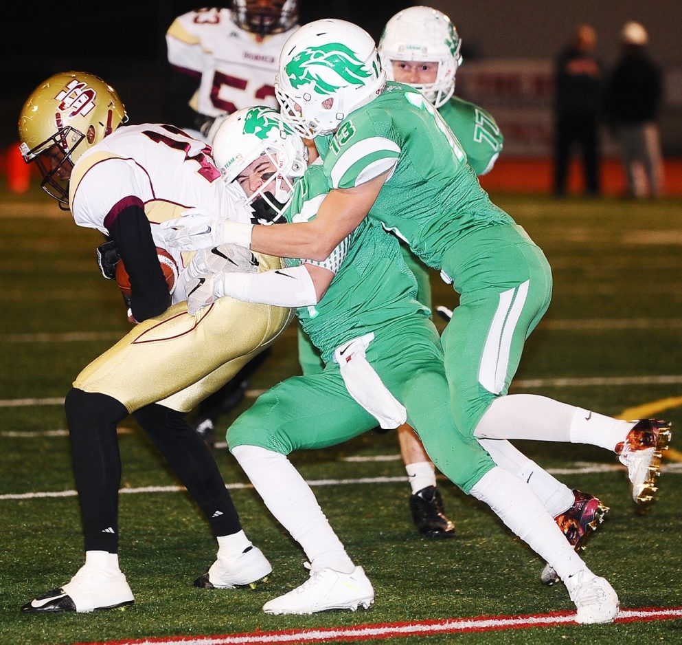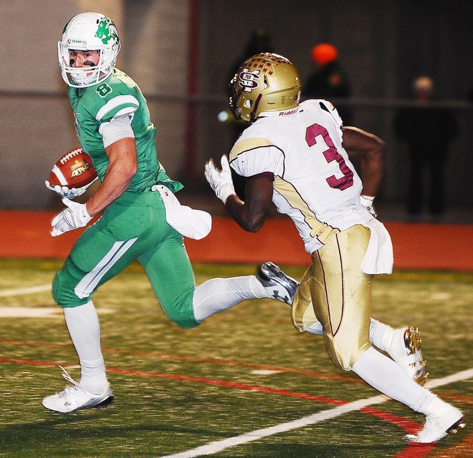 Rossi called a timeout and his quarterback threw a perfect pass over the Ironmen’s blitzing zone defense to Nick Ponikvar for a 35-yard gain to the two-yard line. Two plays later, Hayes punched it in behind left guard to tie it 13-13 with 20 seconds left in the first half.