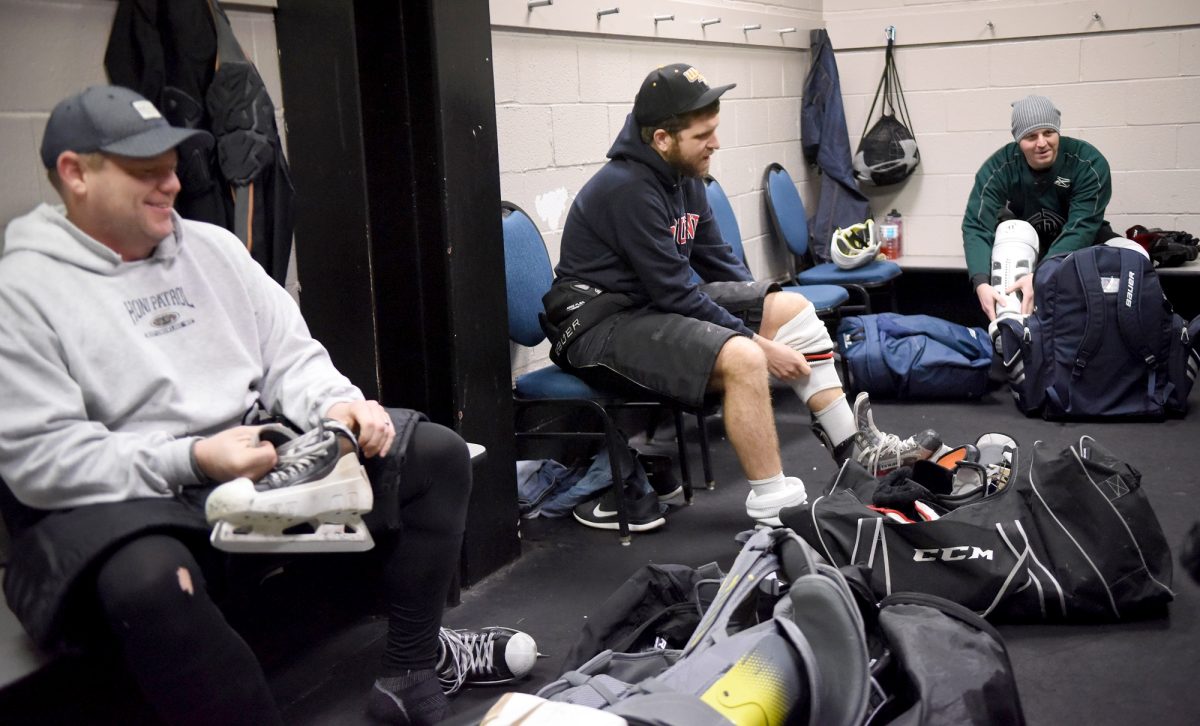 The locker room is filled with friendly trash talk and a little recounting of last week’s game – who fell, which goalie gave up the most goals and where some guys bought their equipment. The topic of discussion never strays away from the sport that brings them together.