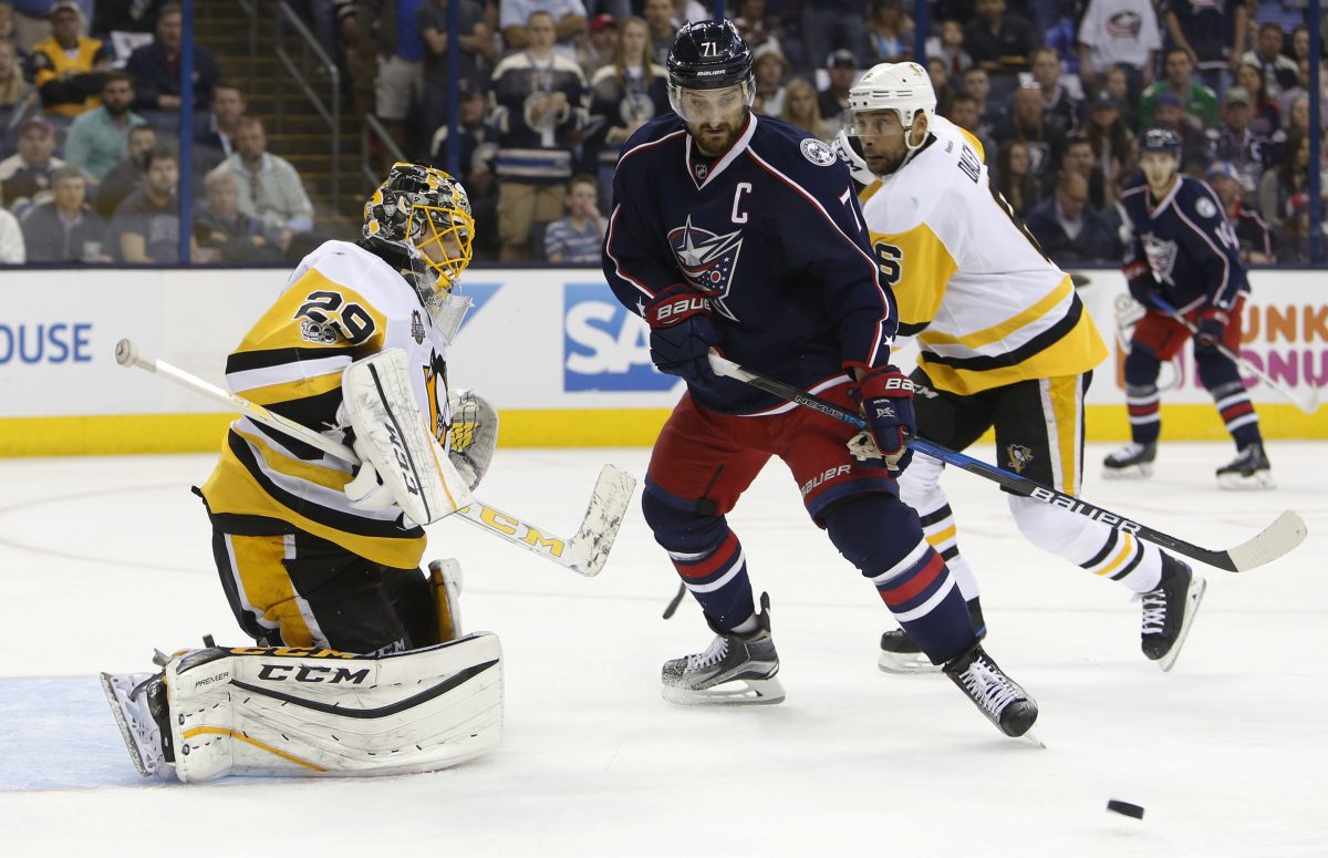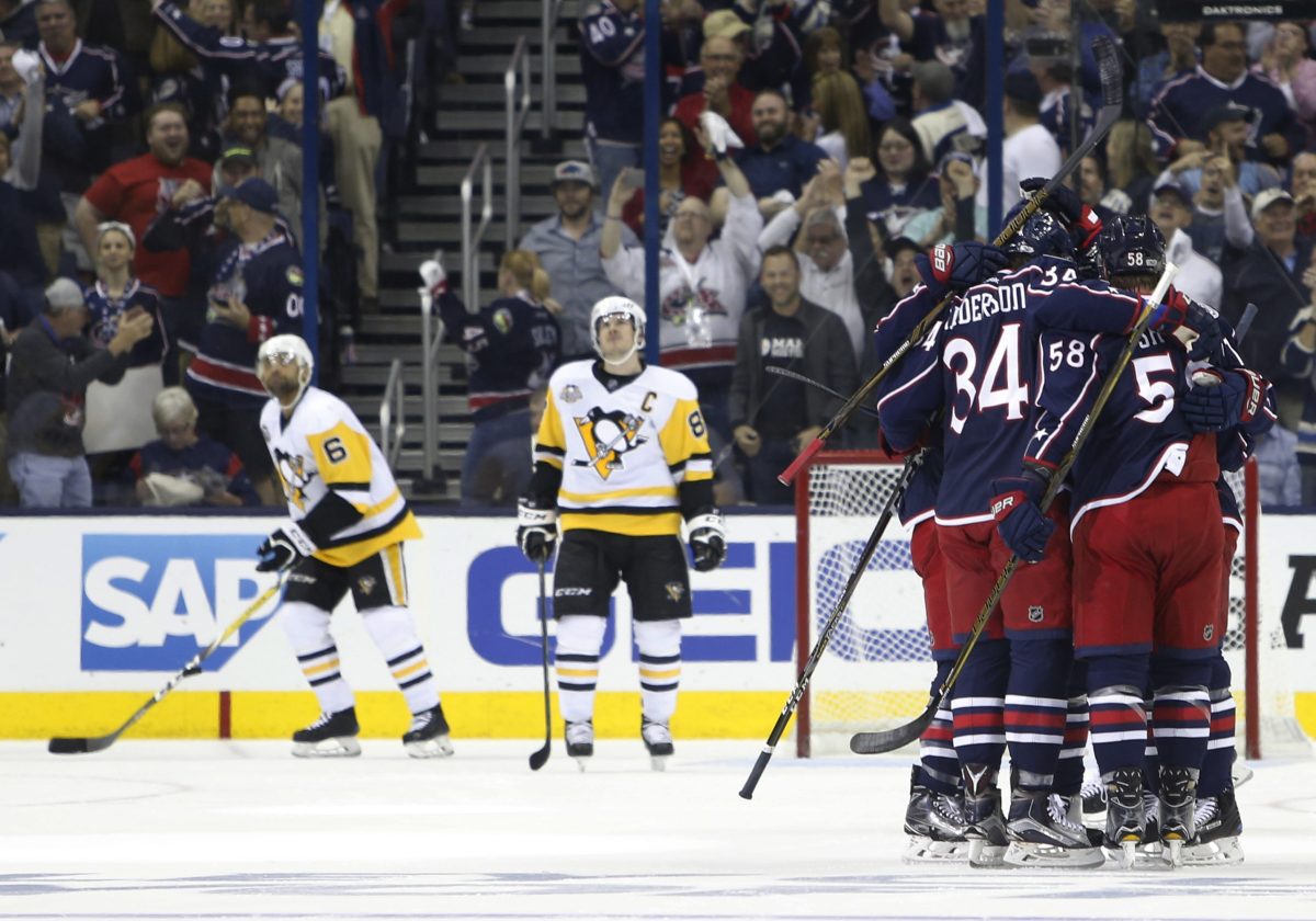 Johnson scored first for the Blue Jackets at 11:46 of the opening period when he launched a wrister from the right point into traffic that bounced off Sidney Crosby’s skate and into the net.