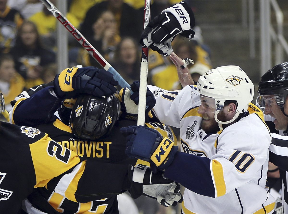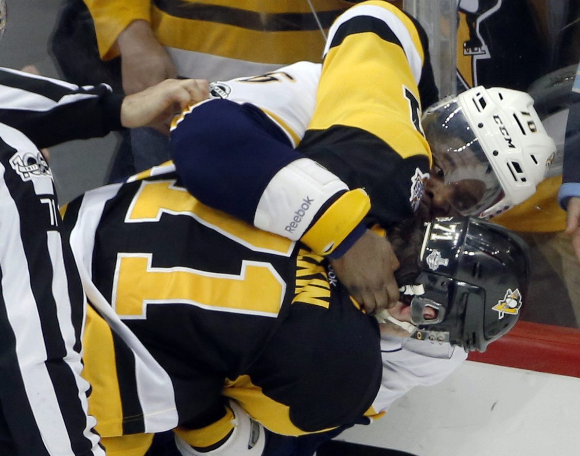 Nashville’s Matt Irwin drilled Pittsburgh’s Matt Cullen from behind into the boards in the first period, a hit that left the 40-year-old Cullen headed down the runway for a quick check but didn’t result in a penalty. Minutes later, Penguins forward Chris Kunitz became tangled up with P.K. Subban and ended up cross-checking Subban in the head, part of a sequence that saw Malkin go off for hooking. Malkin and Subban even ended up fighting in the third period when things got out of hand.
