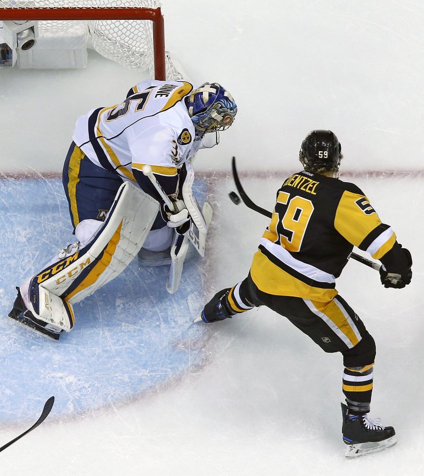 Guentzel’s winner in Game 1 against Nashville is a testament to his vision and patience. He was at center ice when the puck was pinched along the wall. He began sprinting toward the Nashville zone before teammate Brian Dumoulin even had it. By the time Guentzel collected Matt Cullen’s one-touch pass, he was racing in on Rinne. Rather than just fling the puck at the goaltender, he pulled it back , allowing Nashville’s Ryan Ellis to inadvertently screen Rinne. The goaltender could only wave his glove at it as it ripped into the net to put Pittsburgh ahead to stay.