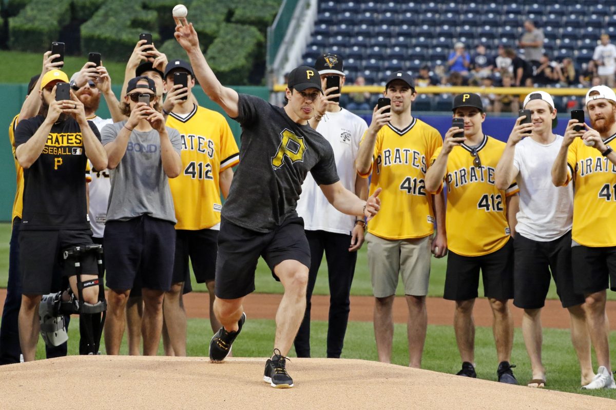 The Penguins, including Crosby, Phil Kessel, Marc-Andre Fleury, Patric Hornqvist and Jake Guentzel, were saluted by the crowd before Crosby threw out the first pitch, a strike to teammate Ron Hainsey.