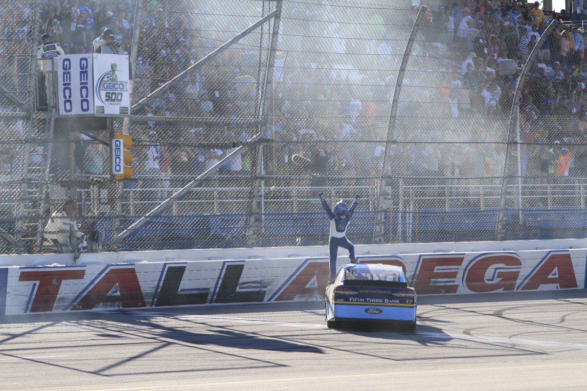 TALLADEGA, Ala. – Ricky Stenhouse Jr. used a strong Ford engine to blow past Kyle Busch in overtime at Talladega Superspeedway Sunday for his first NASCAR Cup victory.