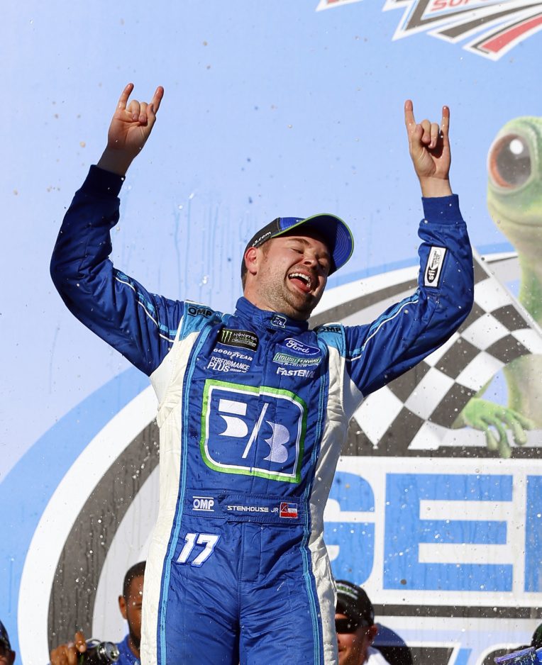 “We’ve been terrible for a long time, but we’ve been getting better and better every race,” said Stenhouse, who took time to note he “parked it” in victory lane for his late friend, Bryan Clauson.