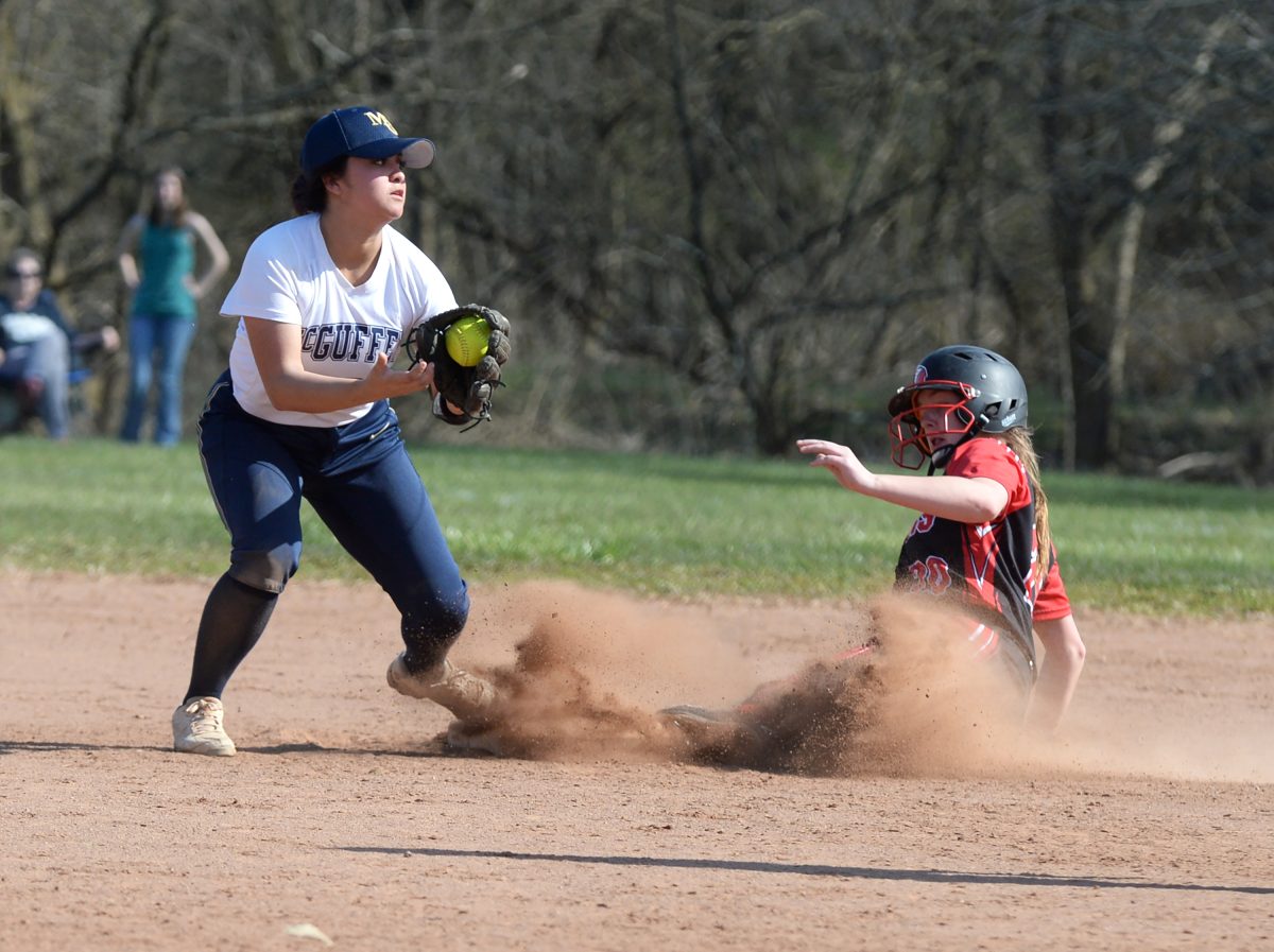 Waynesburg’s Rachel Elsenheimer beats the tag of McGuffey’s Eleanna Serna as she slides into second base during a Section 3-AAA game at McGuffey Community Park.
