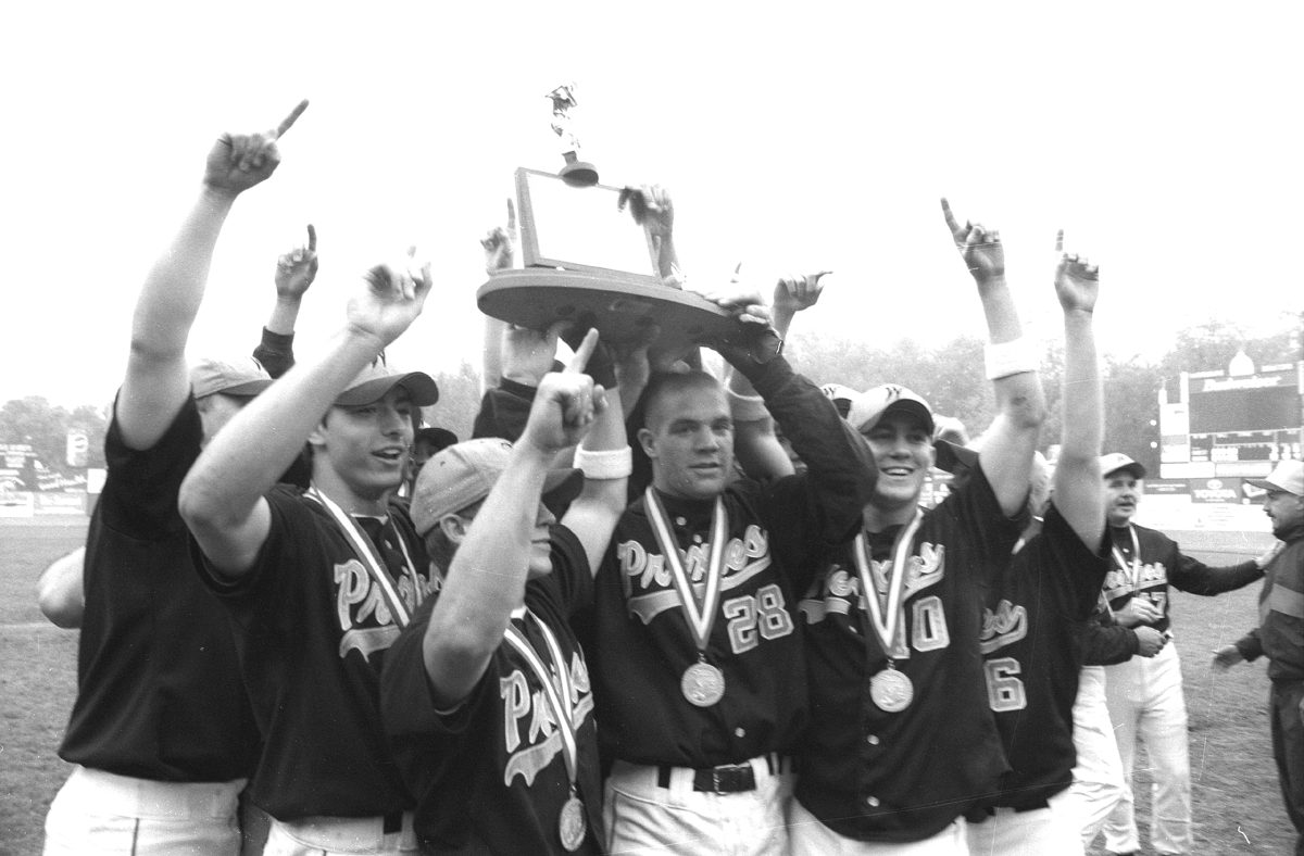 Players from Washington High School's baseball team celebrate after winning the PIAA Class AA title in 1998. The Prexies became the first Washington County team to win a state baseball title. Head coach Bob Peton ended a 35-year career in 2007 with 393 career victories.