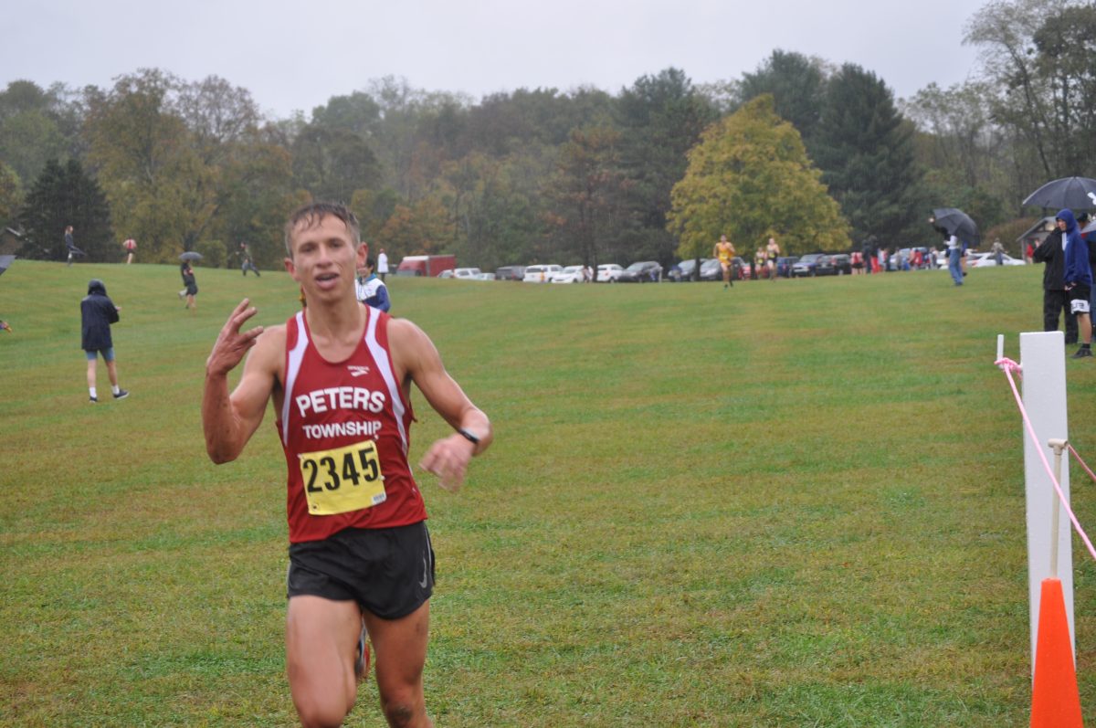 The senior from Peters Township slipped twice and fell but still managed to win his third straight boys title in the Washington County Coaches Cross Country Meet at Mingo Creek County Park Monday.