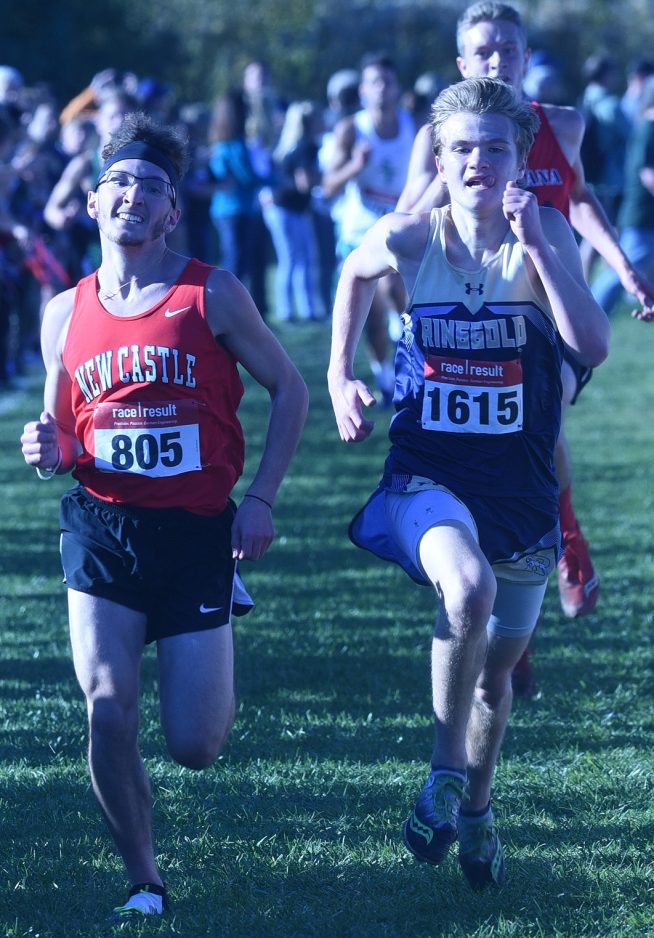 Ringgold junior Lucas Pajak was neck-and-neck with senior Anthony Litrenta of New Castle over the final 20 yards. They both crossed in 17:04 but Pajak was deemed third on a photo finish.