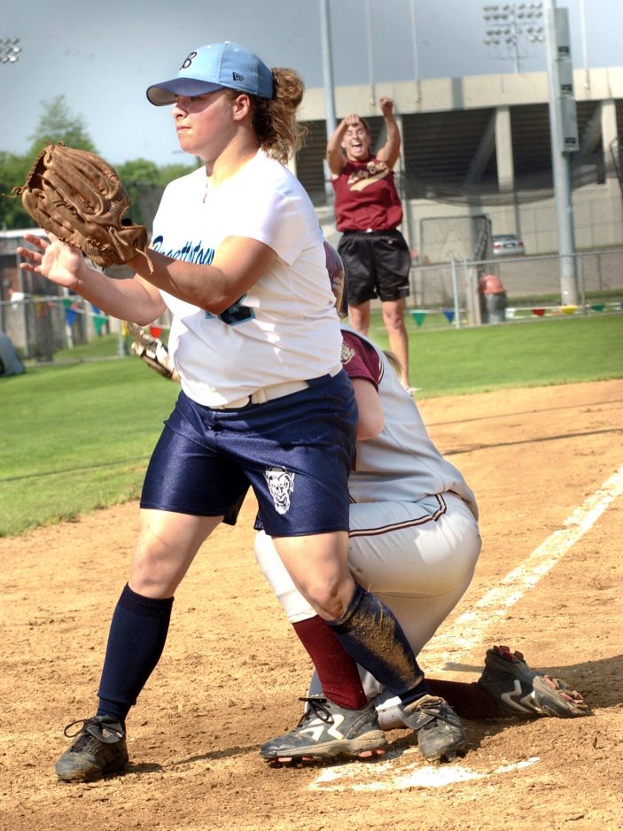 With two outs in the first inning and Burgettstown’s Jamie Petrel on second base, Arnold, the Bucs’ catcher, had a third strike glance off her glove. Arnold recovered and tried to throw out batter Heather Markley at first base, but the throw sailed wide and directly to right fielder Shanna Tarr.