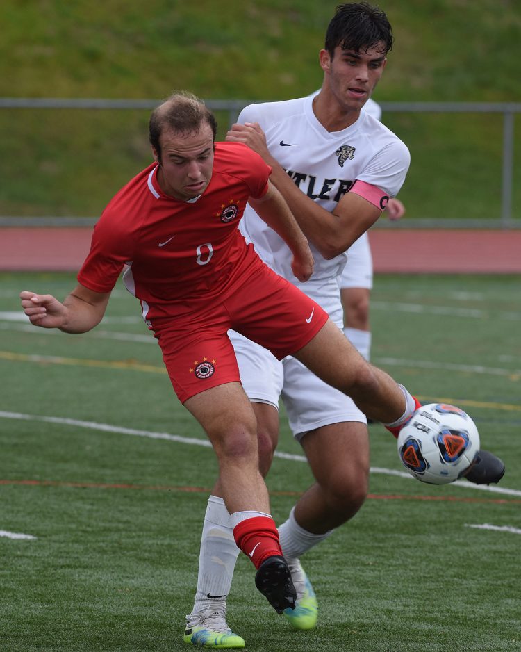 Despite being knocked forward by Butler's Jack Beneigh, Andrew Massucci from Peters Township maintains control of the soccer ball during WPIAL Quad-A boys' quarterfinal soccer playoff action. Massucci scored a hat trick to lead the Indians to victory, 4-2.