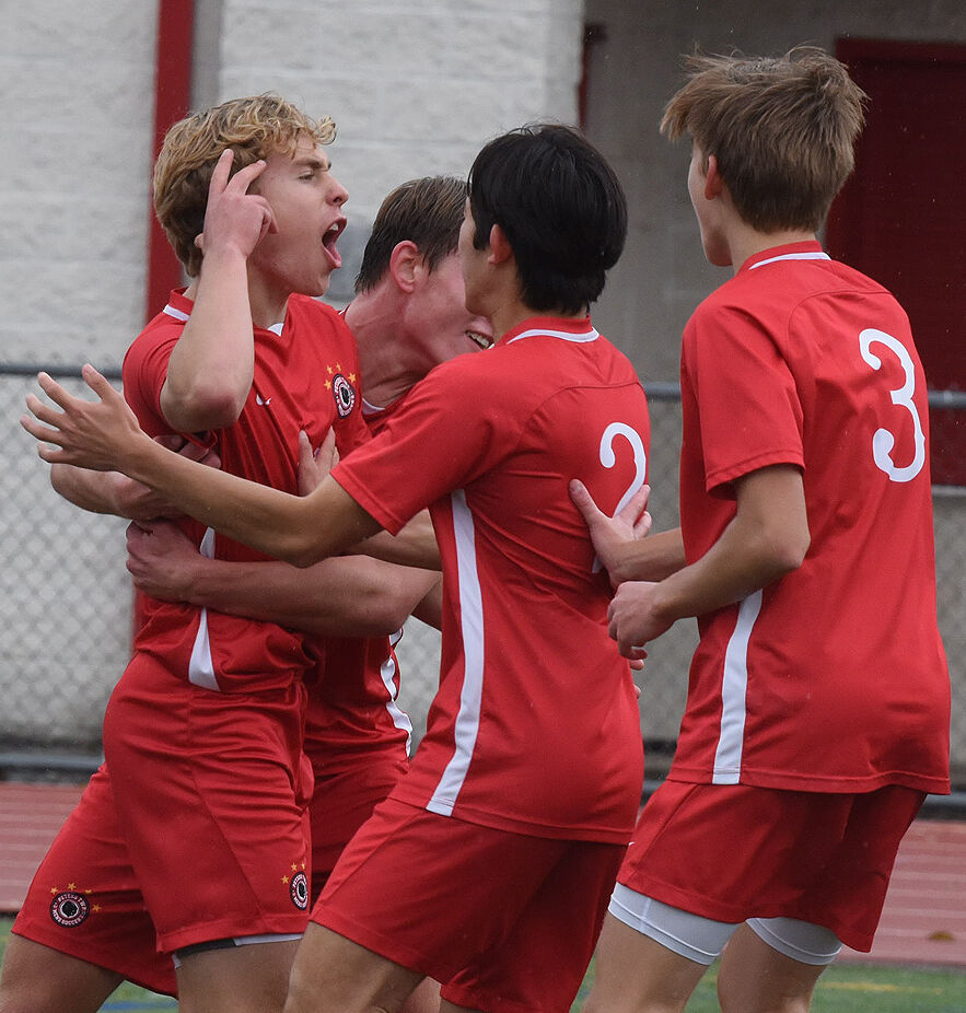 Austin Marmol celebrates with Alex Grim (2) and Cole Woodward (3) after scoring second goal in Peters Township's 4-2 victory over Butler in the quarterfinals of the WPIAL Quad-A soccer playoffs.
