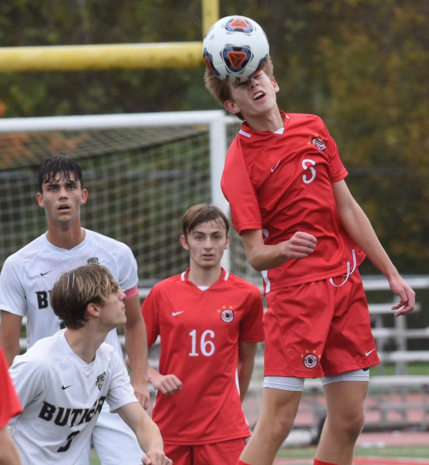 Peters Township's Cole Woodward (3) heads the ball away from Butler's Aiden Soley (3) while Aiden Wisda (28) and Aidan Martik (16) watch the play develop during WPIAL Quad-A quarterfinal soccer playoff action.