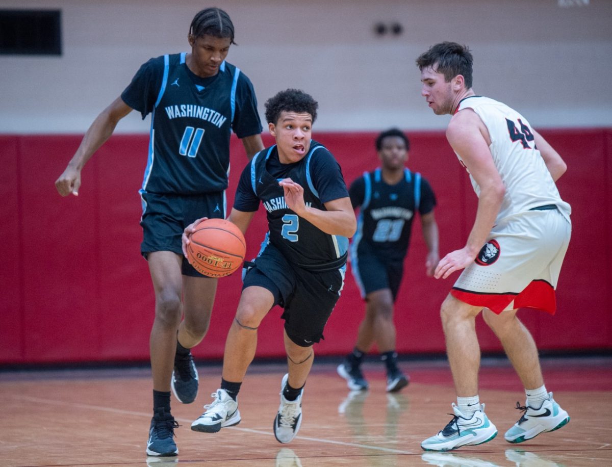 Washington’s Mario Griffin (2) rushes the basketball upcourt and around Charleroi’s Will Wagner.