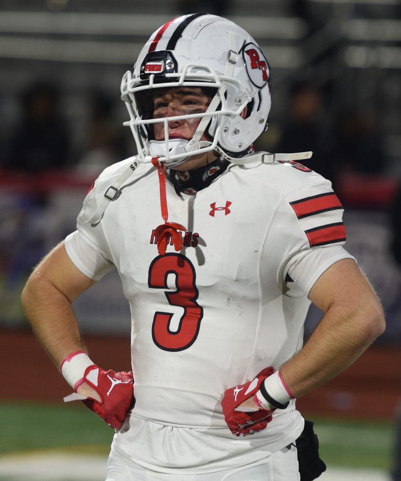 Peters Township won the snap and deferred to the second half, but the Panthers marched 64 yards in 12 plays before the school located in Philadelphia borrowed a play from the NFL’s Eagles and quarterback Mikal Davis scored on a “tush push” or “brotherly shove” from 1-yard out. Kenny Woseley, who is Penn State bound, kicked the first of five PATs for a 7-0 lead with 8:19 left in the first quarter. Davis rushed for 70 yards on 11 carries. He didn’t need to put the ball in the air much, but was 8 of 12 for 184 yards and 1 touchdown.