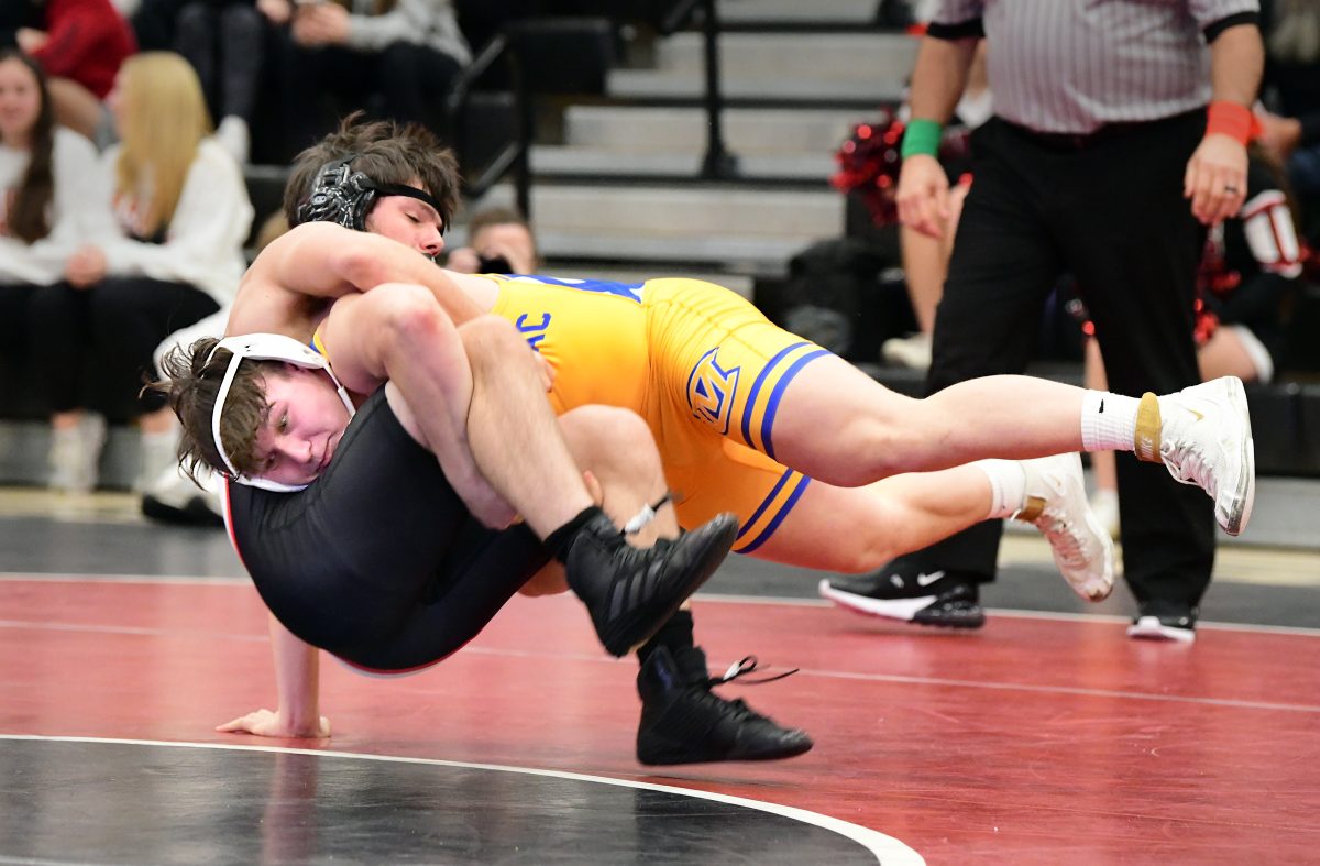 The Big Macs’ Andrew Binni, who was second in the state last year and finished eighth at the Walsh Jesuit Ironman tournament this past weekend, pinned Ky Szewczyk to start the dual meet at 127.