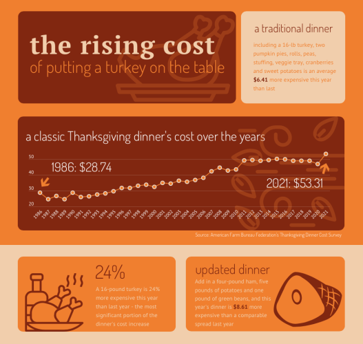 Thanksgiving dinner prices are at an all-time high.Turkey – king of the Thanksgiving feast – is the most expensive it has been since 2015. This year, the average bird costs $1.50 per pound, a 24% increase over last year’s turkey prices.“The overall Thanksgiving market basket – about ...