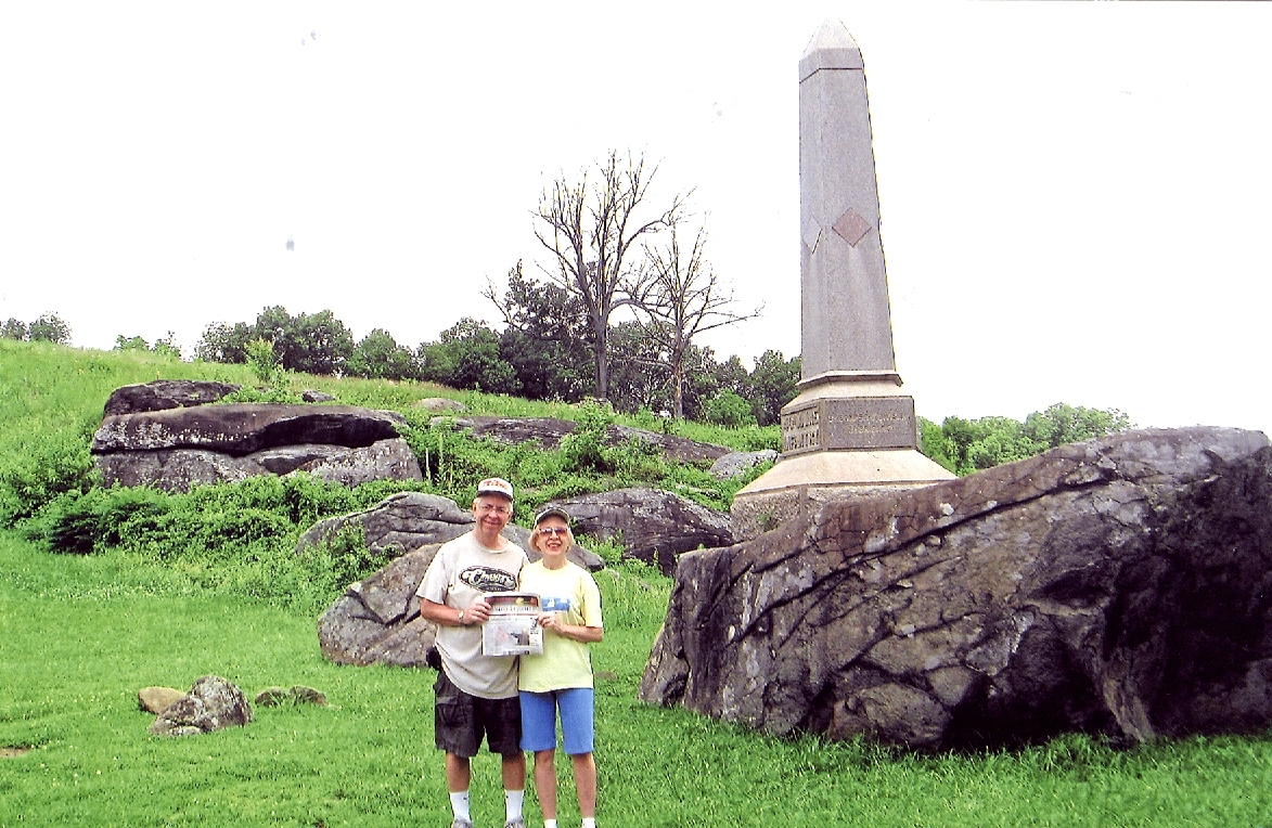 Jim and Brenda Moore of McMurray took the O-R along as they toured the battlefields of Gettysburg. Behind them is Devil's Den.