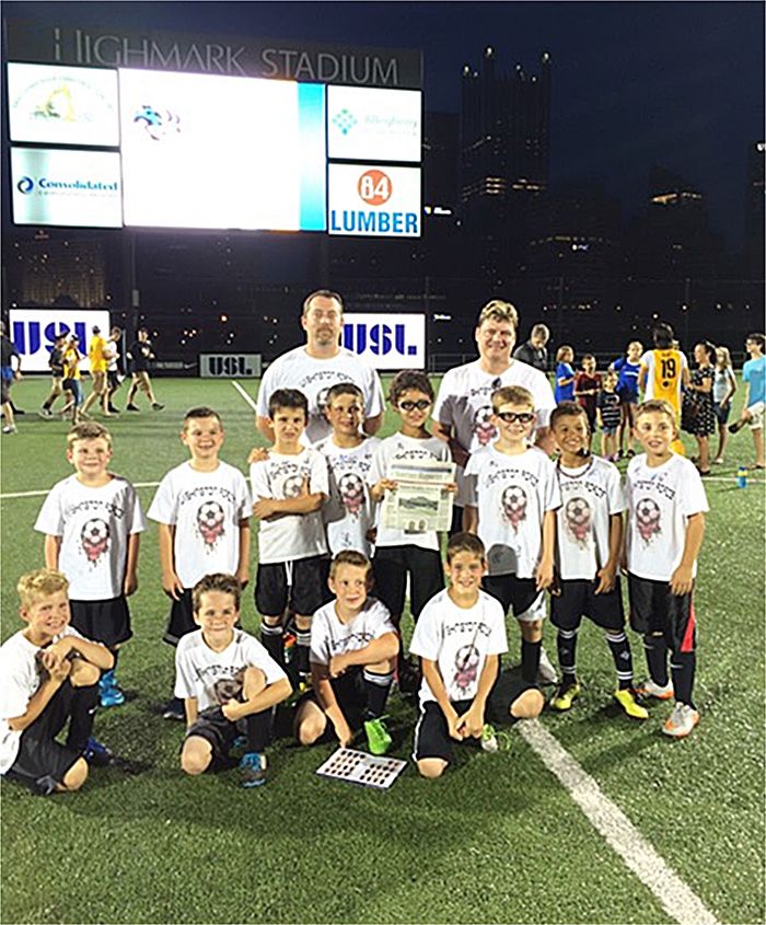 Members of the Washington Force 10 and under soccer team took the O-R along on their trip to Pittsburgh to participate in the Pittsburgh Riverhounds Youth Experience. As part of the program, each player got to escort a Riverhounds player onto the field during introductions of the game against Louisville City, be a ball boy on the field and play a halftime exhibit game against South Park. Front row, from left, are Ryan Torboli, Talon Gardner, Andy Palm and Zane Garner; back row, Brody Knight, Ian Migyanko, Luke Burt, Nico Mauro, coah Tim Knight, Jacob Burt, coach Randy Jordan, Braeden Knight, Darius Clark and Jace Jordan.