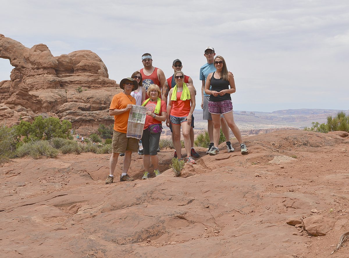 Jonathan and Darlene Taylor of Houston took the O-R along on a family vacation in July to Utah. They are pictured with TJ Dunn and Shelly Lewis of Houston, Brian and Halsey Stockdale of Canonsburg and Jon and Julie Taylor of Cleveland, Ohio. They are pictured at Arches National Park.