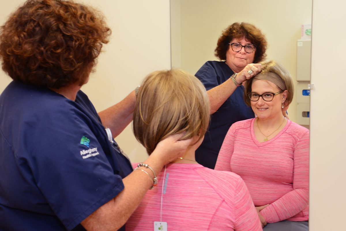Colleen Presken often sees oncology patients right after they’ve received some disheartening news. “Some of them are in tears while they’re in here because they may have just found out from our oncologist across the hall that they’re going to lose their hair with chemotherapy,” says the radiation/oncology nurse at Allegheny Health Network’s Peters Township Health + Wellness Pavilion. “Then they come over here and find out they look pretty good in a wig and some say, ‘Oh, this is gonna be okay.'”