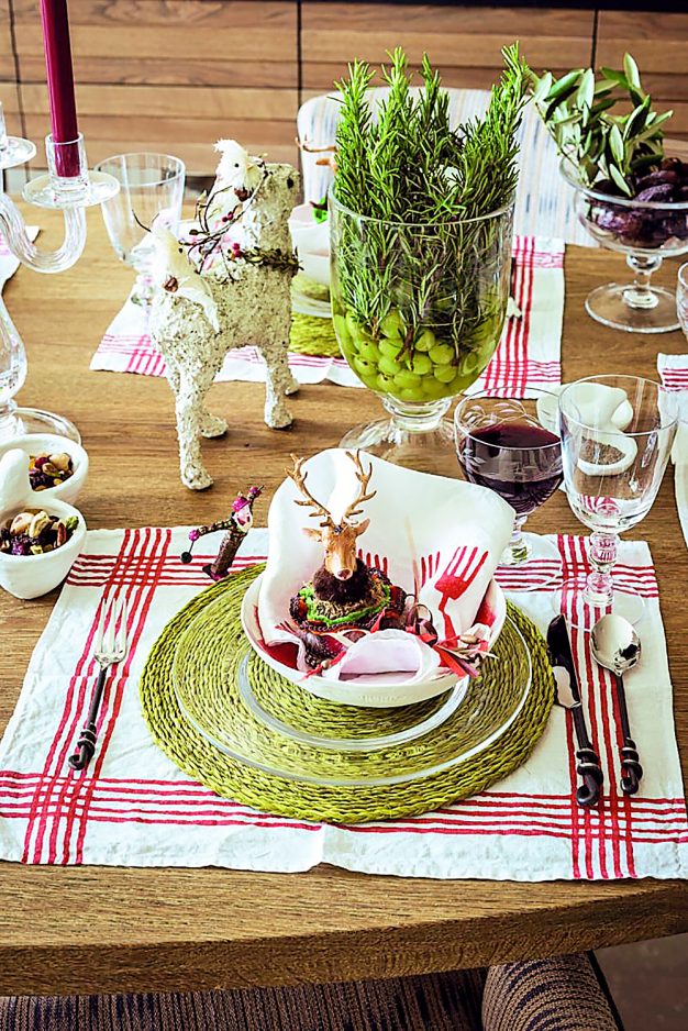 Design your centerpiece with a combination of greenery and lights. Choose glass receptacles that will show off seasonal offerings such as fruit or nuts mixed with flowers and sprigs of green. The Alpine table shown here has grapes and rosemary layered in footed hurricane lamps. Space non-scented candles along the table. Battery-operated mini-lights entwined around a central setting are a sparkly delight.