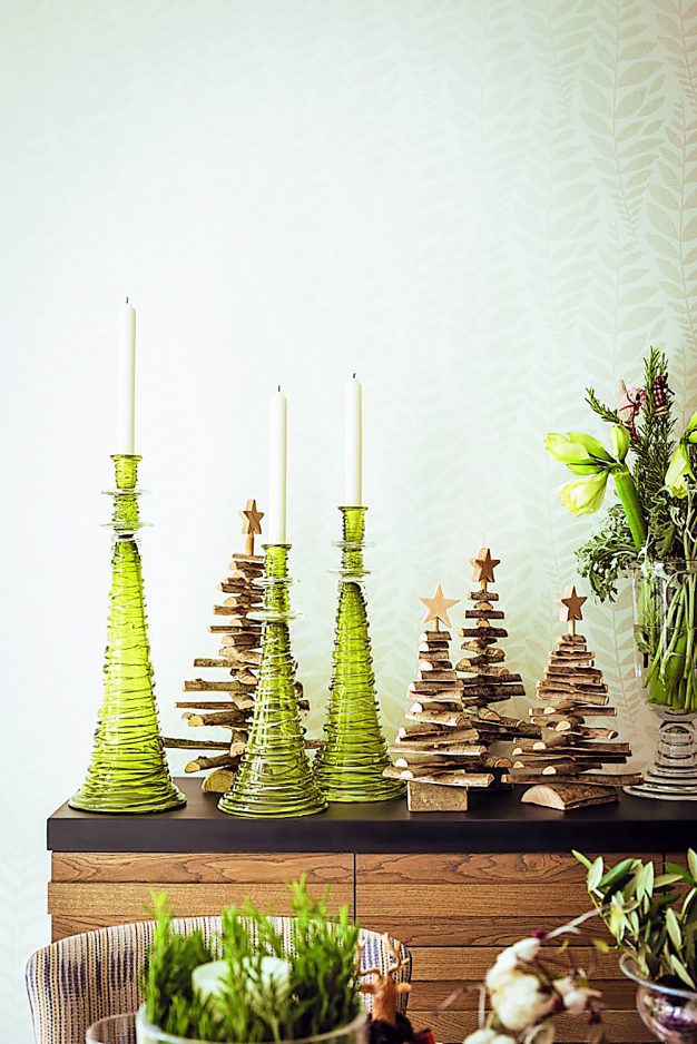 A side table or buffet offers space to continue your theme and does not have to disappear after the meal. In fact, a fanciful scenario will brighten your home for the weeks that surround the holidays right into the new year. A trio of green art glass candlesticks surround graphic wooden Christmas trees in a vignette from William Yeoward’s book “Blue & White and Other Stories,” which I reviewed last month. A simple selection of colors – in this case green, white and red – reflect the rustic atmosphere of an Alpine holiday.