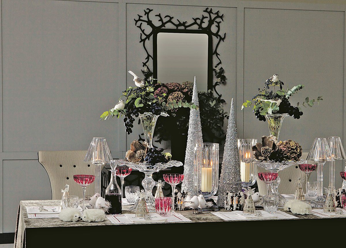 For those with a flair for glitter and glamour, Yeoward sets his table with beautiful crystal and glass, shimmery silver trees and rose-tinted goblets. Gorgeous crystal comports are laden with grapes and greenery. Pure white birds complete the idyllic scene.